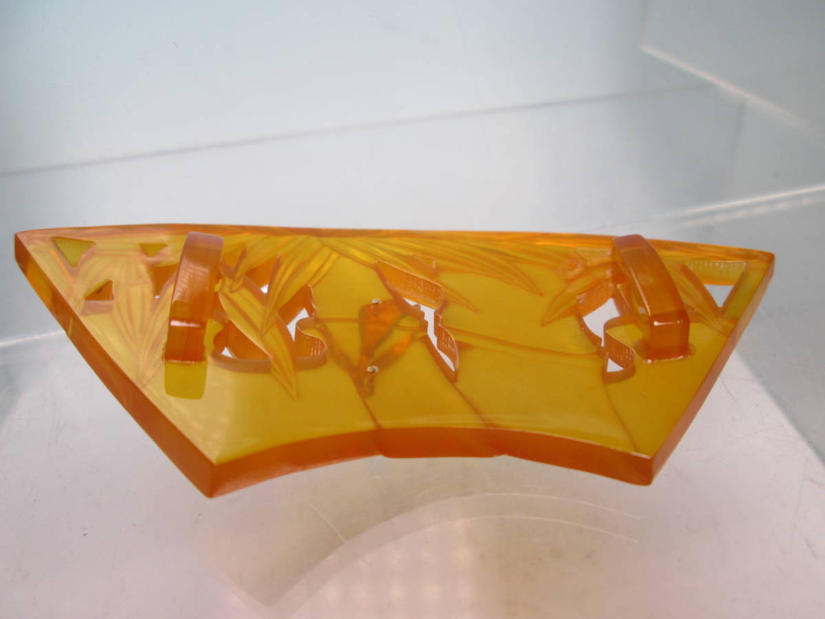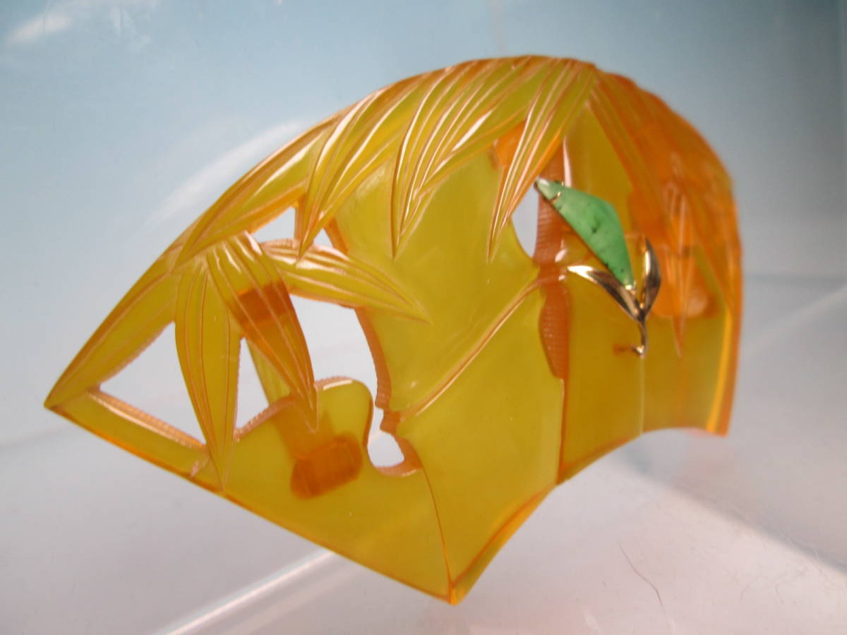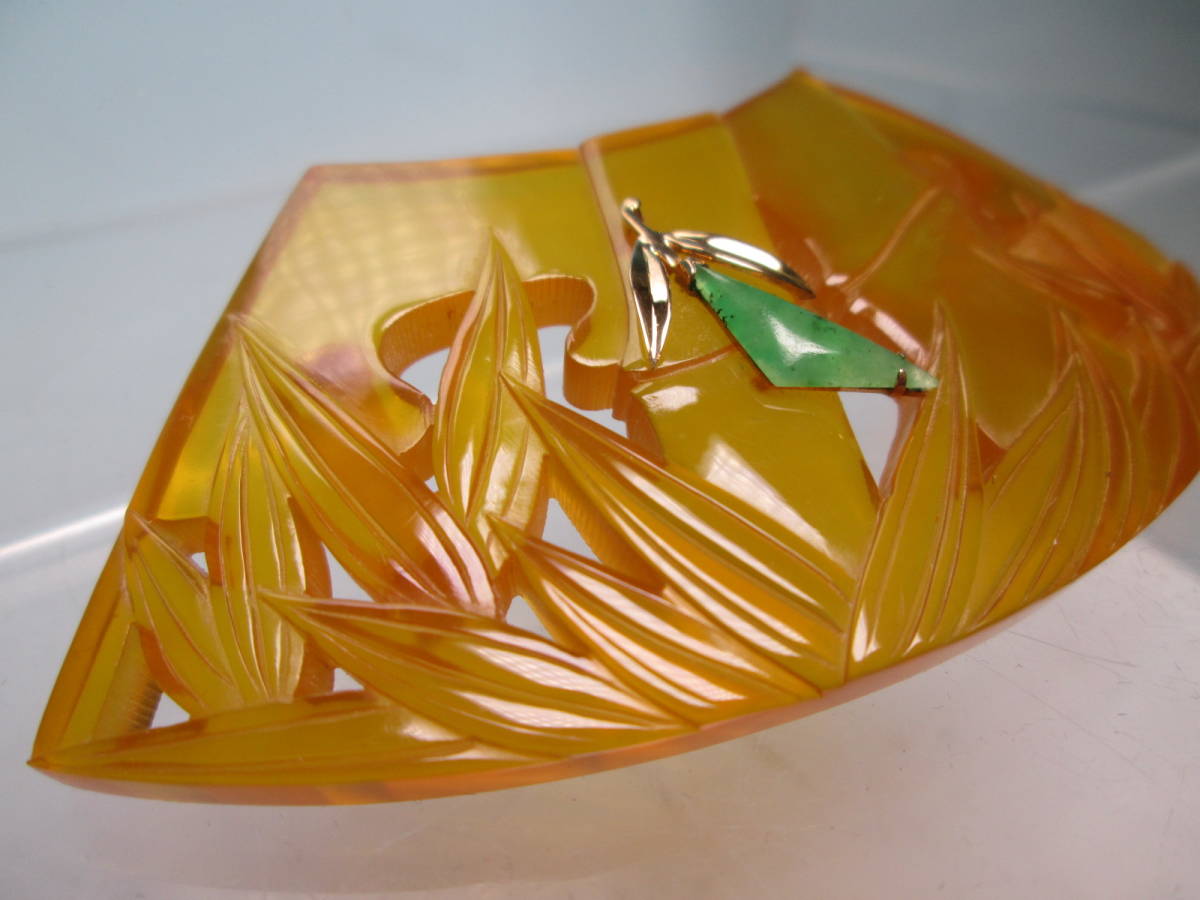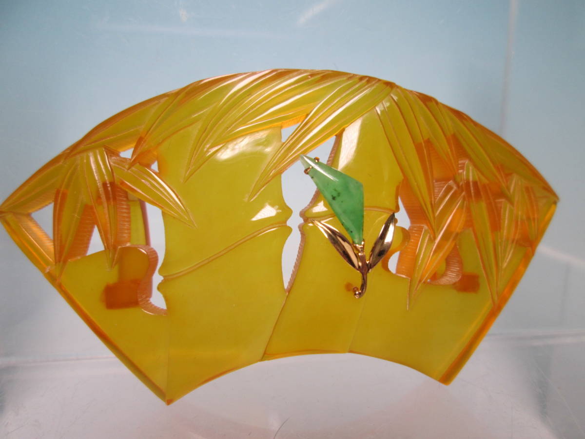 【江月】K18 大振り 8,35cm 本鼈甲 翡翠飾り 笹竹透かし文扇面の帯留め 12,68g 共ケース付