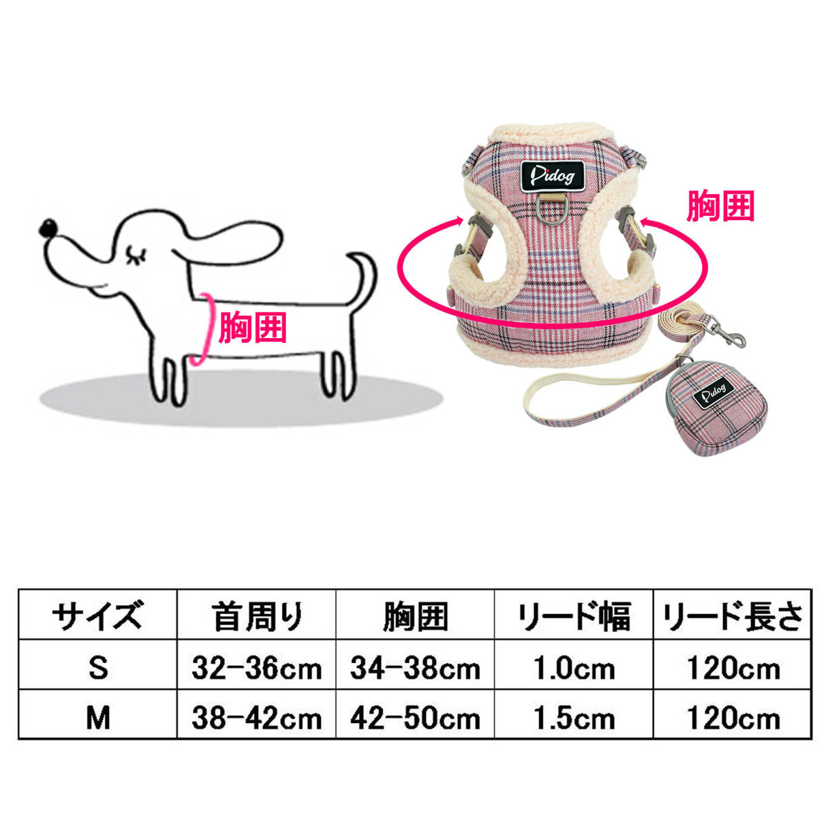 Mサイズ ポーチ付き ハーネス&リード セット チェック柄 モフモフ 犬用 ペット ドッグ 猫 ピンク