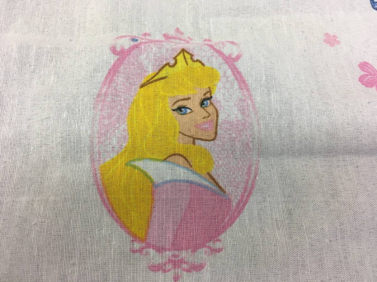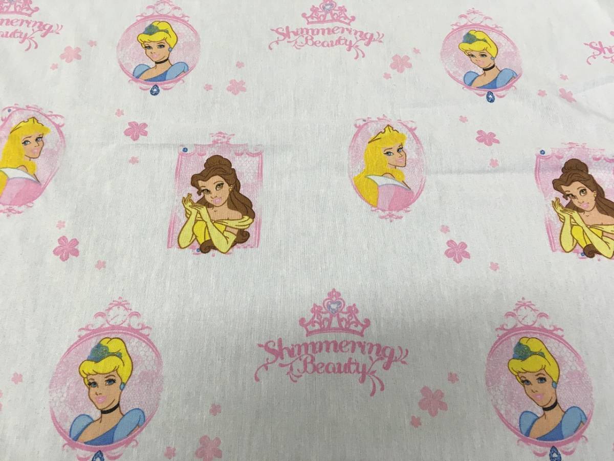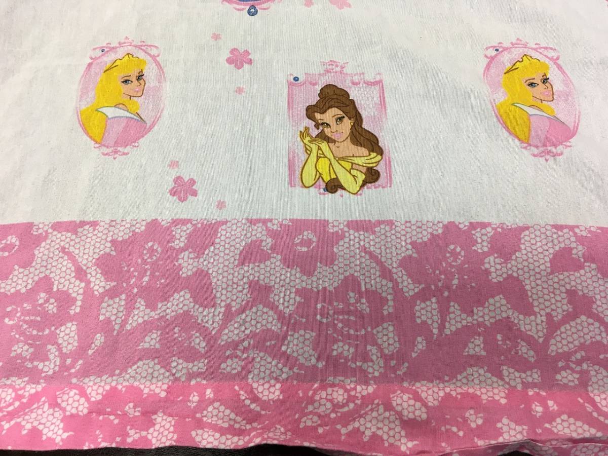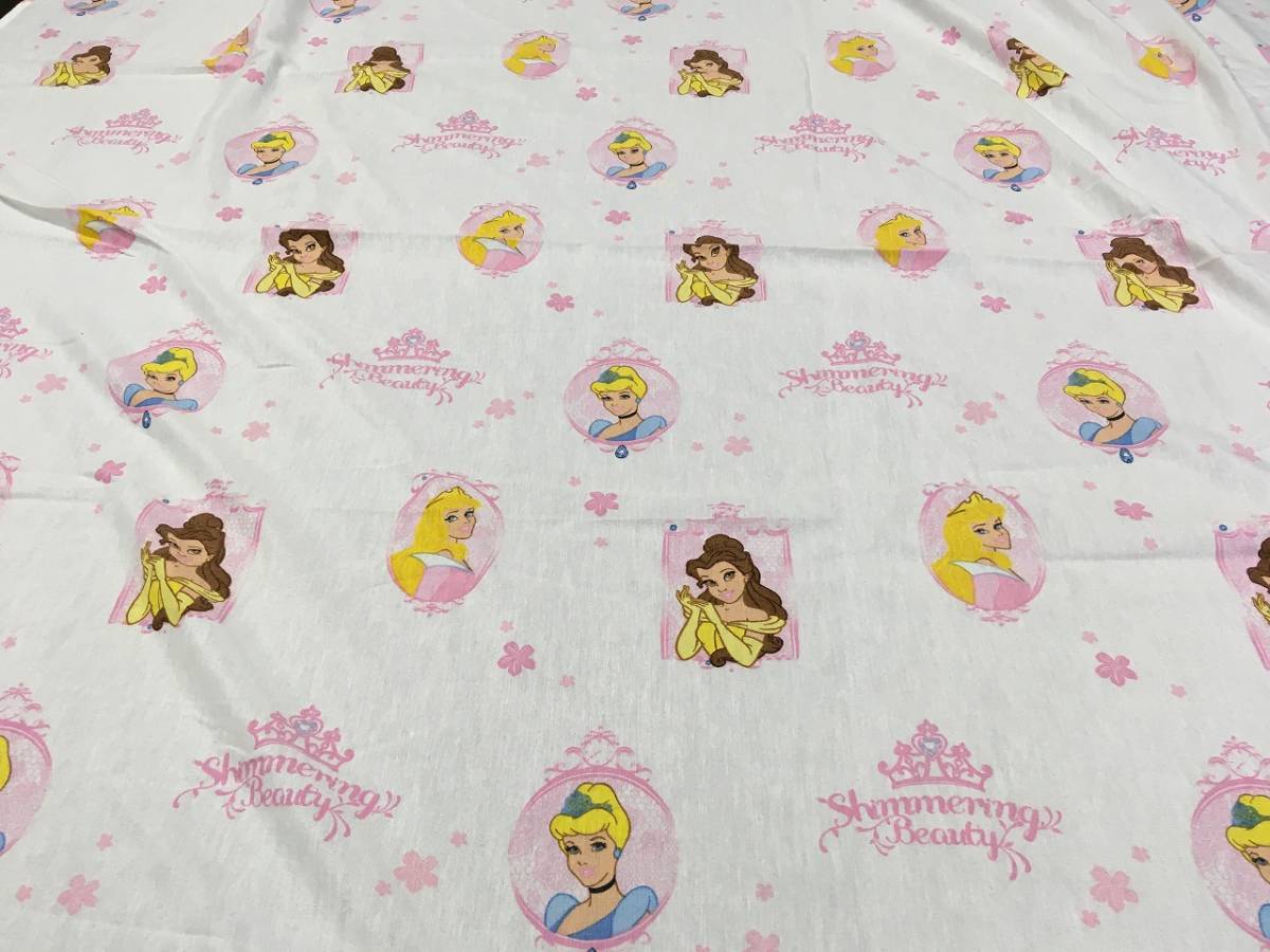 プリンセスのフラットシーツ中古品、アメリカで購入しました。 サイズはTWINの表記で縦約232cm・横約164cmです。  素人の採寸ですので若干の誤差はお許し下さい。下の部分約16cm柄が違います。