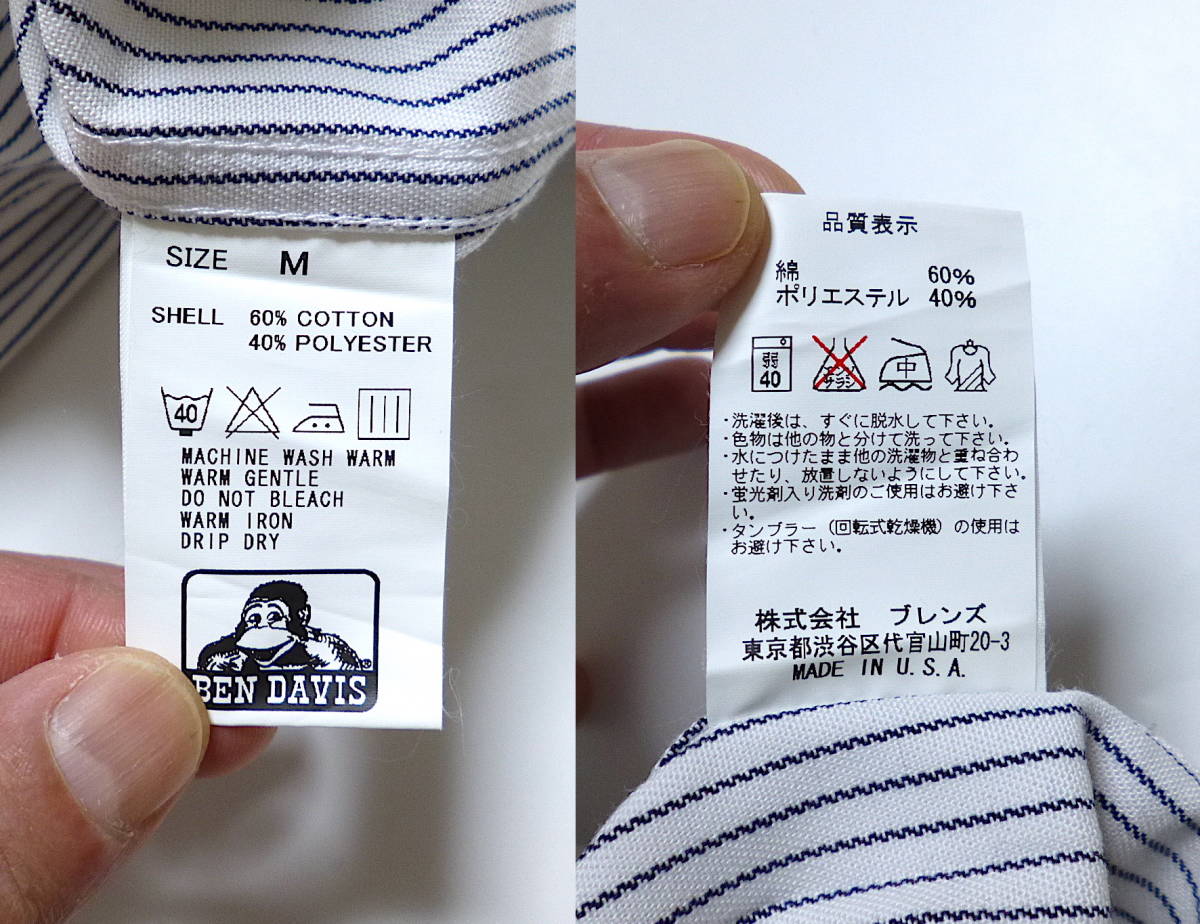 | コメント | 株式会社ブレンズ取り扱い。USA製。全体的なデザインはベーシックな感じで、エリはボタンダウン(3点留め)、スソはラウンド、ポケットは左ムネに付いたデザインになります。両サイドのスソにマチ付きです。他にもベンデイビスのアイテムや、その他いろいろなアイテムを出品しています。よろしければご覧ください。 |