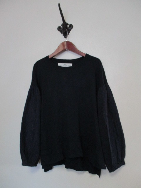 | 商品紹介 | 本体はニット、袖はレースのオシャレなトップスです。 色はネイビーです。 袖口にはゴムでギャザーが入っています。 《素材》 本体:コットン95% カシミヤ5% 布帛部分:コットン100% |