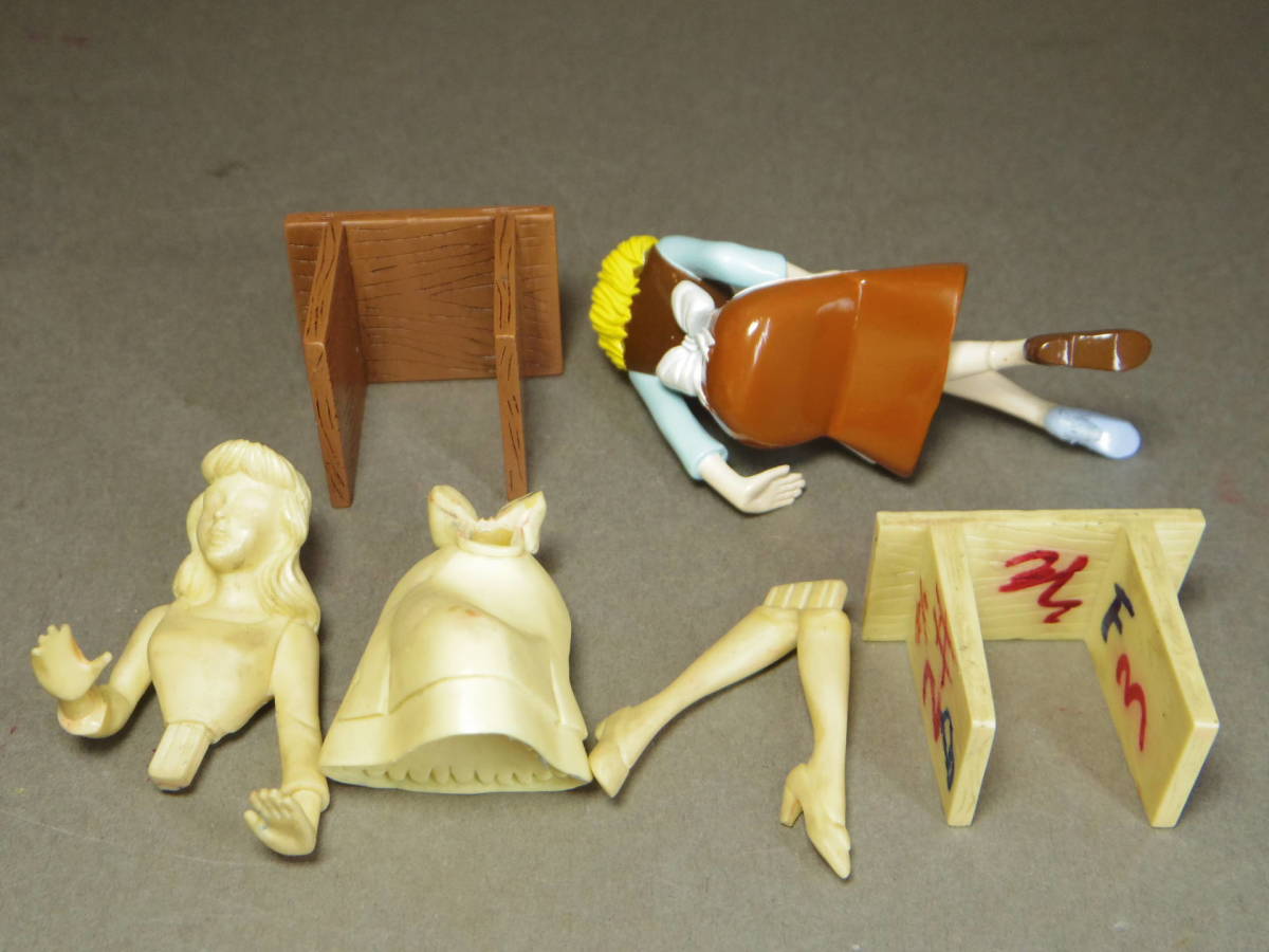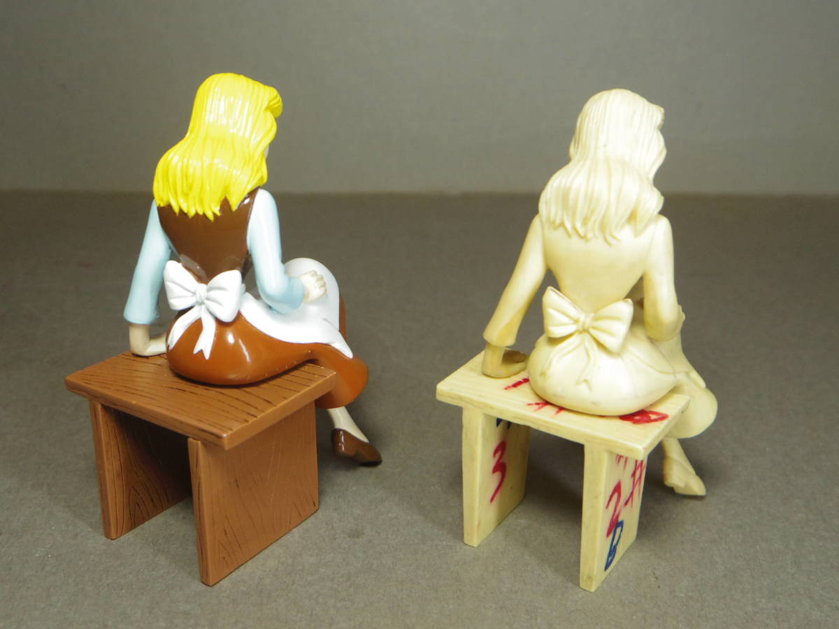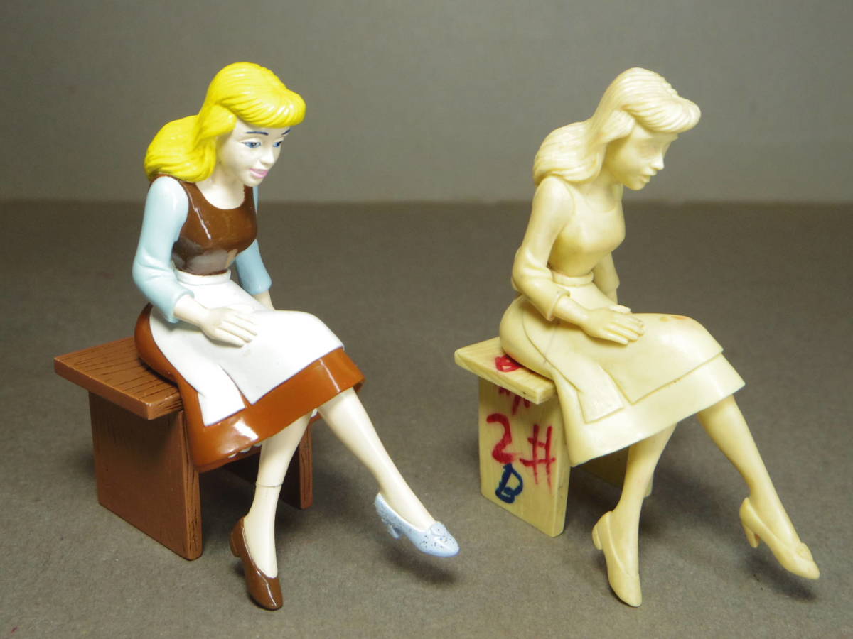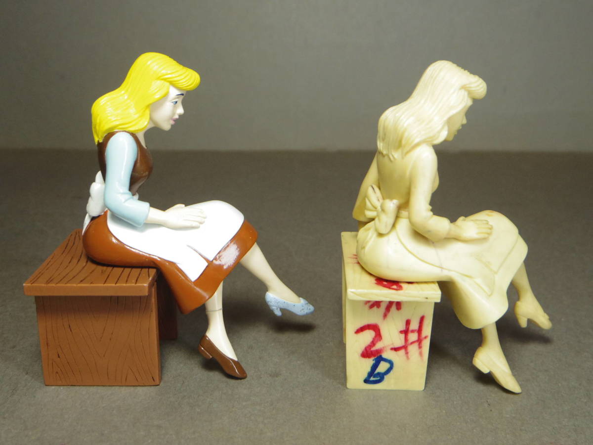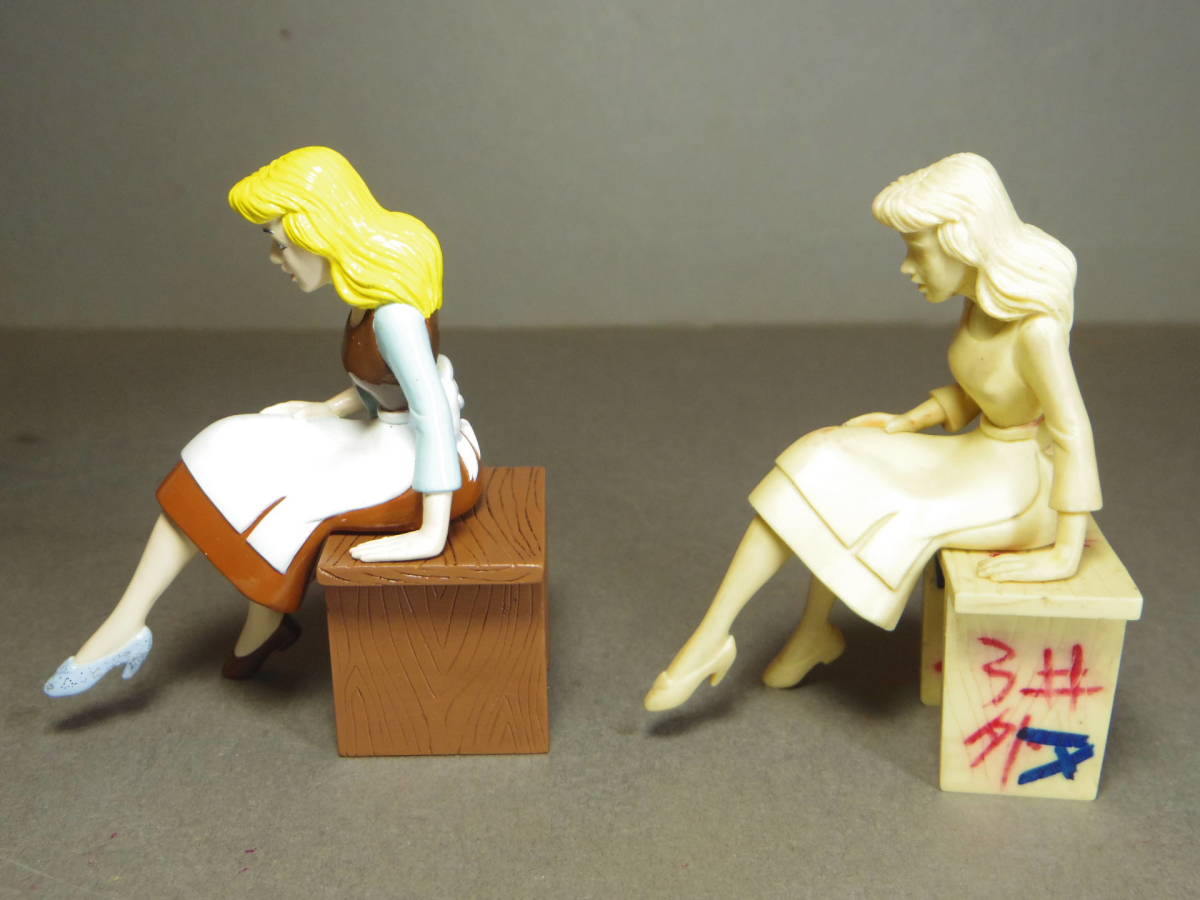 非常に貴重な、ドイツBULLYLAND社製のシンデレラのPVCフィギュア制作の際に使用された試作品(彩色済み)と原型のセットです。高さはどちらも約8.1cmです。 試作品はフィギュアと腰掛けは一体化されていません。原型はシンデレラが3つに分割され、腰掛けと合わせて4分割されています(5枚目の写真)。 細かな傷・汚れがあります。特に原型の方は使用感があり、腰掛けにペンでメモの用な物が書かれています。 |