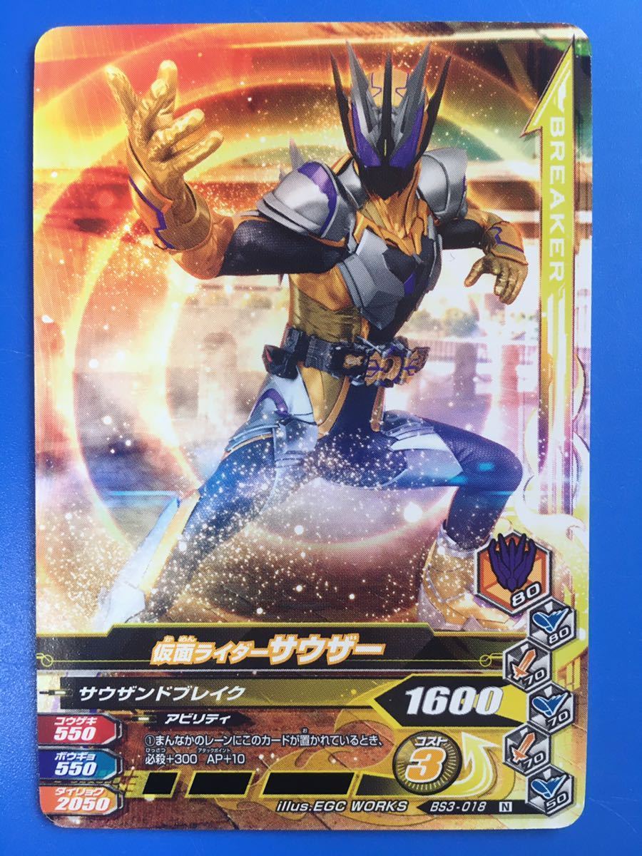 仮面ライダー、ガンバライジング・第BS3弾からNo.018《仮面ライダーサウザー》の登場です。発送は、普通郵便を利用します。(特にご希望のない場合)おとりまとめも可能ですが、送料に変動する場合がございます。また、送料のご請求は、自宅での計量を基準にご請求させていただいておりますので、実際の金額と差異が出る場合もございます。予めご了承ください。他にも多数出品中です。まとめてこの機会にいかがでしょうか?ご質問お待ちしております。
