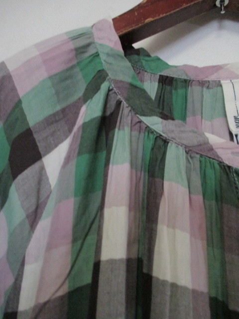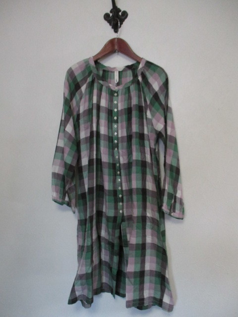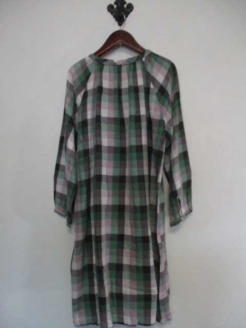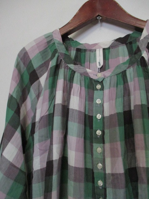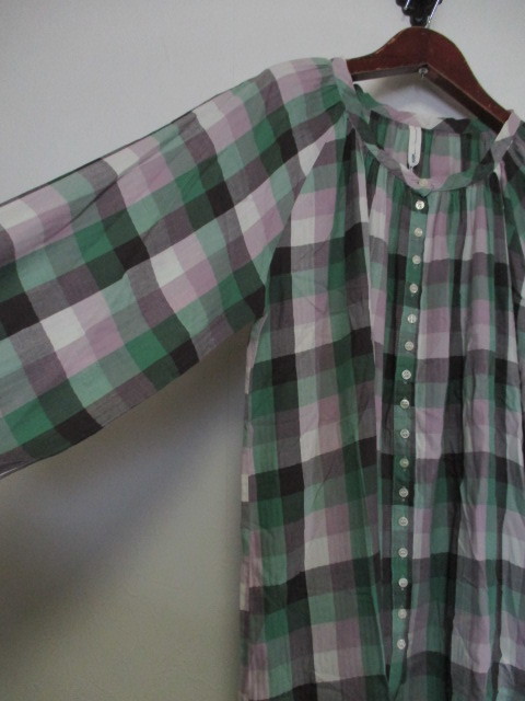 | 商品紹介 | チェック柄の長袖チュニックです。 ノーカラーで、襟周りにギャザーがあります。 ボタンは途中までしか付いていなく、 下の方(裾から約34cmくらいから)は開いたデザインになっています。 色は緑、薄紫、茶、白等です。 《素材》 綿100% |