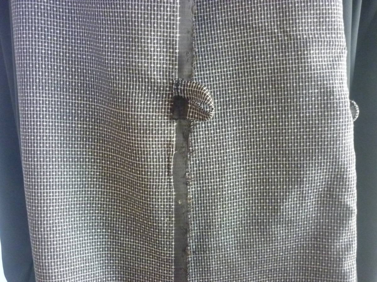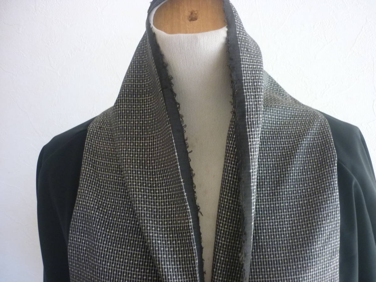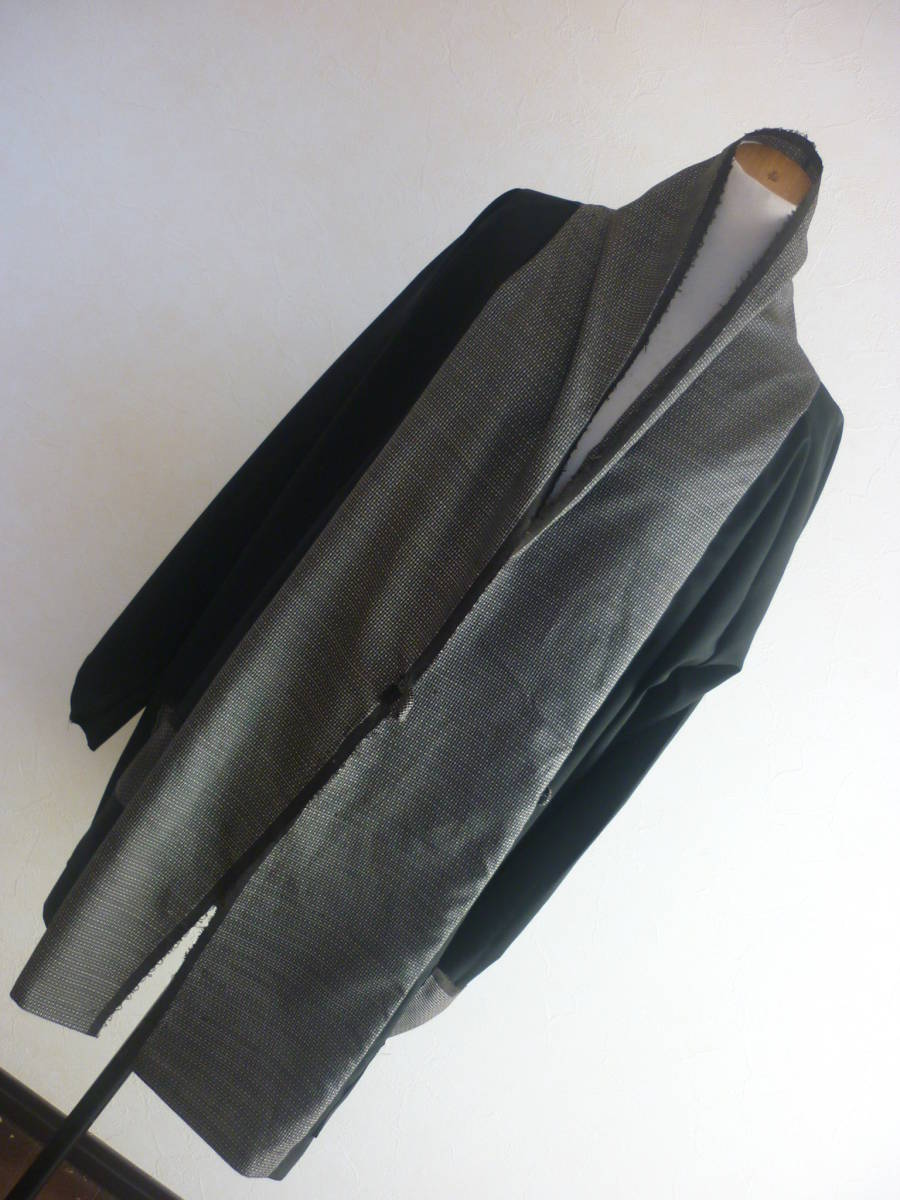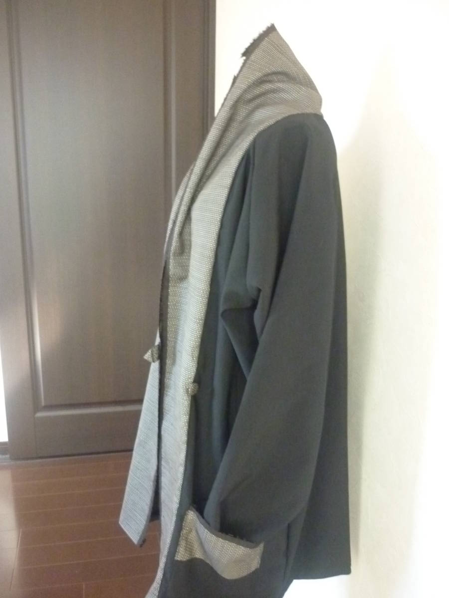 ~4L程度の方迄、ご着用頂けます花粉ガード加工の黒生地を使用した春物コートをハンドメイド致しました。泥大島紬の着物を解いて、花粉ガード加工(生地店表示)の新反の黒生地にて、スプリングコートをハンドメイド致しました。実寸は、脇下身幅63、総丈82程度で、ご着用頂きやすいように、ラグラン袖にしております。ポケットを2つ付け、くるみボタンを1つ付けております。