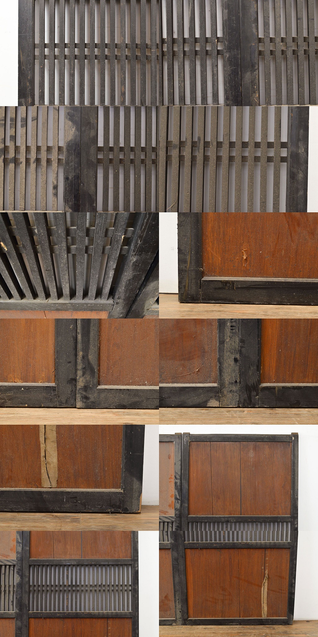 R-051167 アンティーク建具 明治大正期 赤みがかった茶色と黒のコントラストがおしゃれな格子帯戸3枚セット(引き戸)(R-051167)