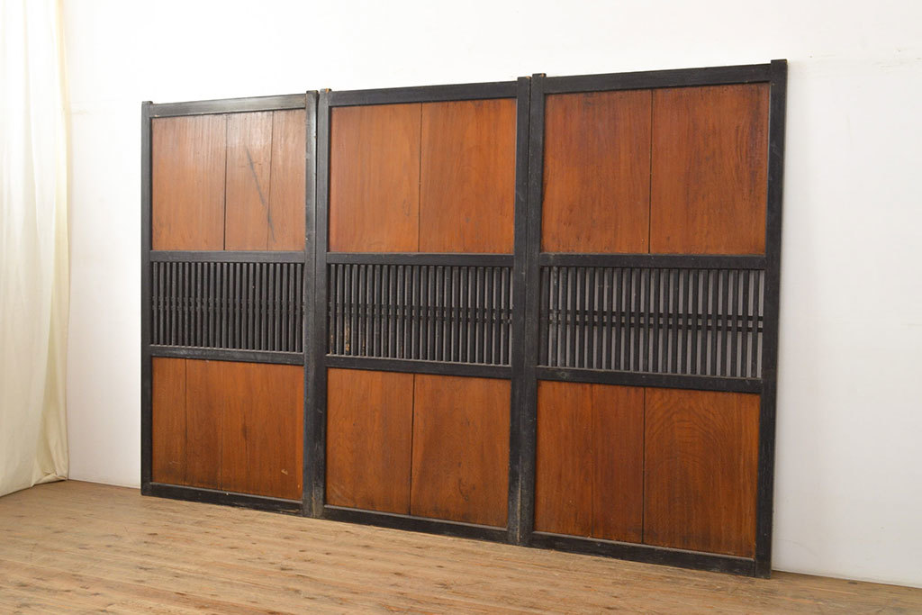 アンティーク建具 明治大正期 赤みがかった茶色と黒のコントラストがおしゃれな格子帯戸3枚セット(引き戸)(R-051167)
