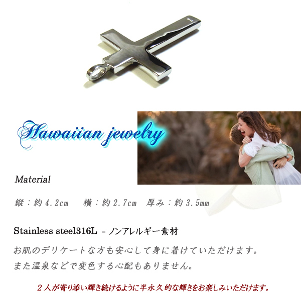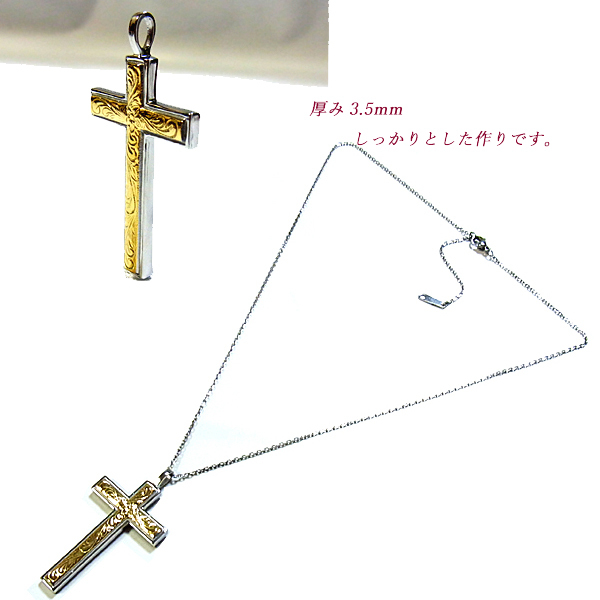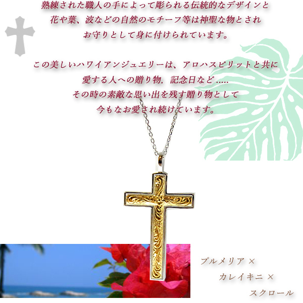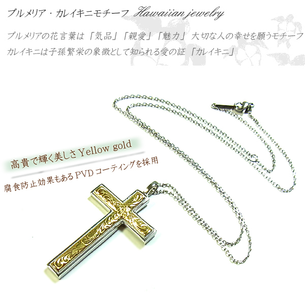 ★ハワイアンジュエリー★金属アレルギー&温泉&海水浴OK★ステンレスネックレス★ゴールド&シルバーコンビクロス&プルメリア&スクロール★