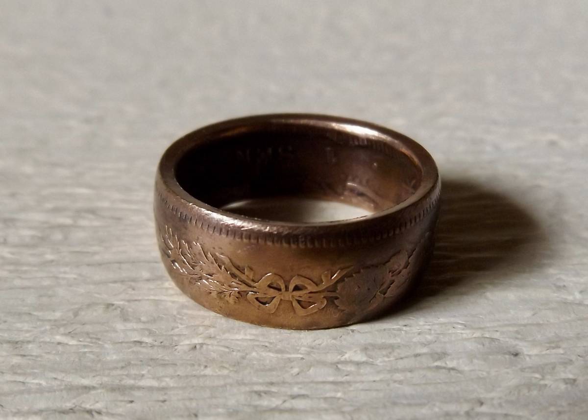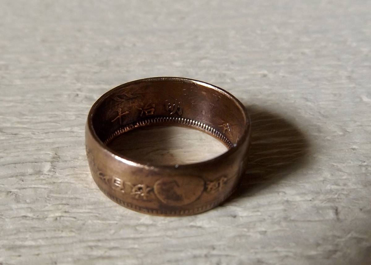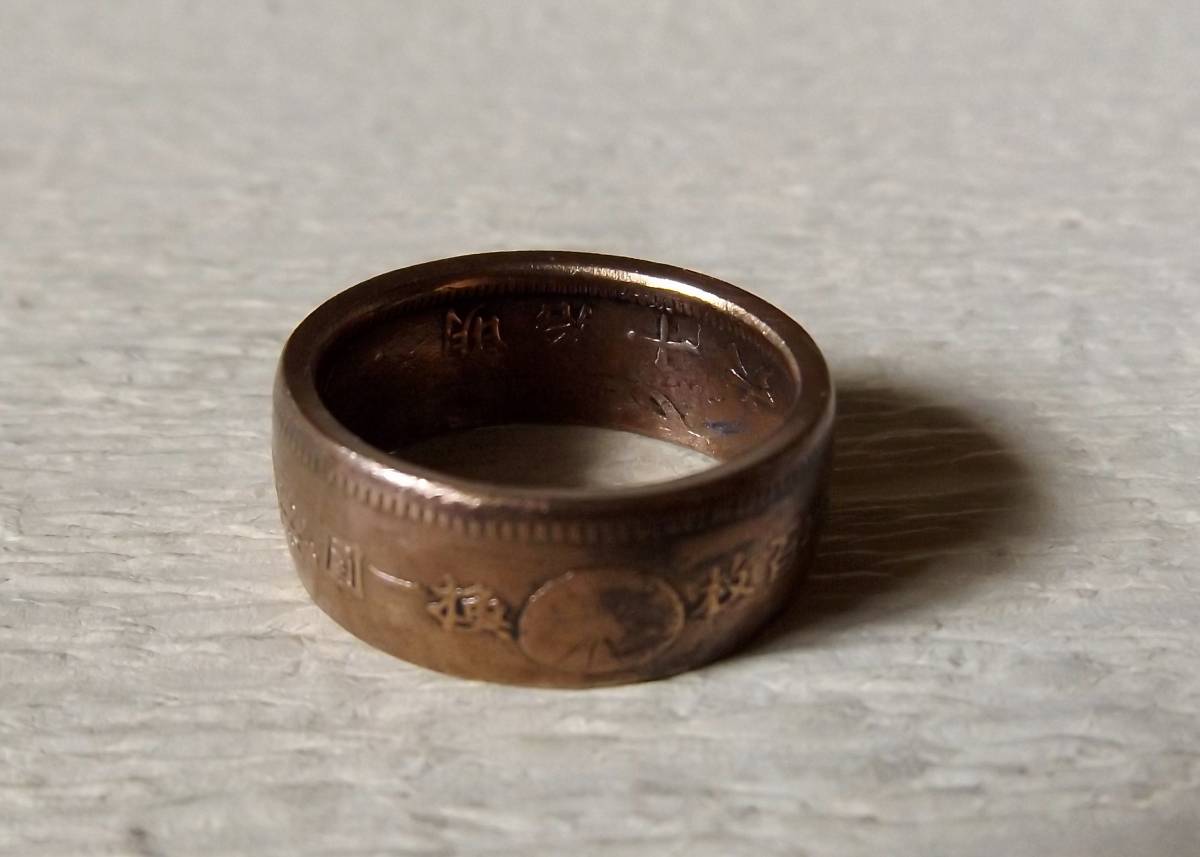 この商品は、明治16年発行の竜1銭銅貨を使用。銅貨に穴を明け木槌で叩いてコインリングに成形した1点ものです。