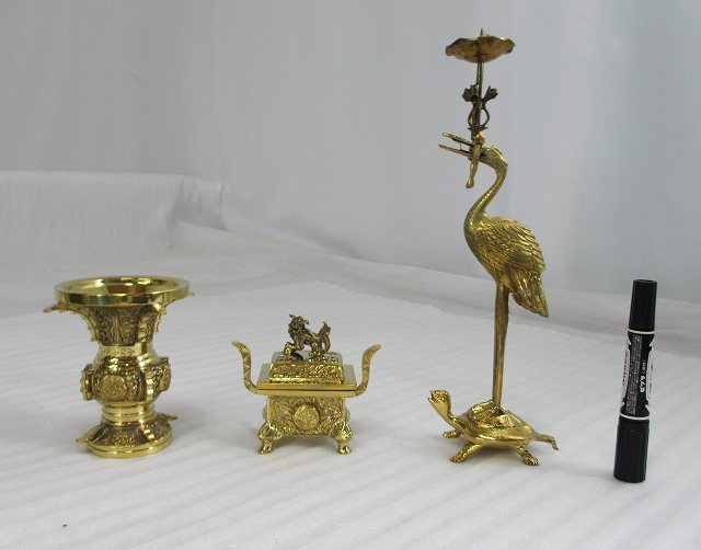 | 〇材質 真鍮製 磨き 〇サイズ <花瓶>口径 約9.5センチ 高さ 約12センチ <鶴亀>高さ 約30センチ <香炉>幅 約7.5センチ 総高さ 約10センチ 〇状態 長期保管品の為、保管時の多少劣化ございますので、ご了承ください。 注意事項 〇手計測のため、サイズに多少の誤差がある場合があります。 〇こちらは1点のみの出品です。 | |||