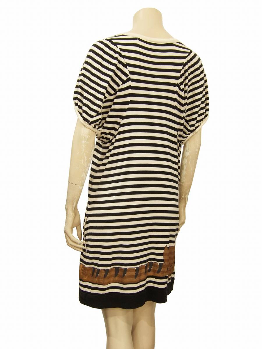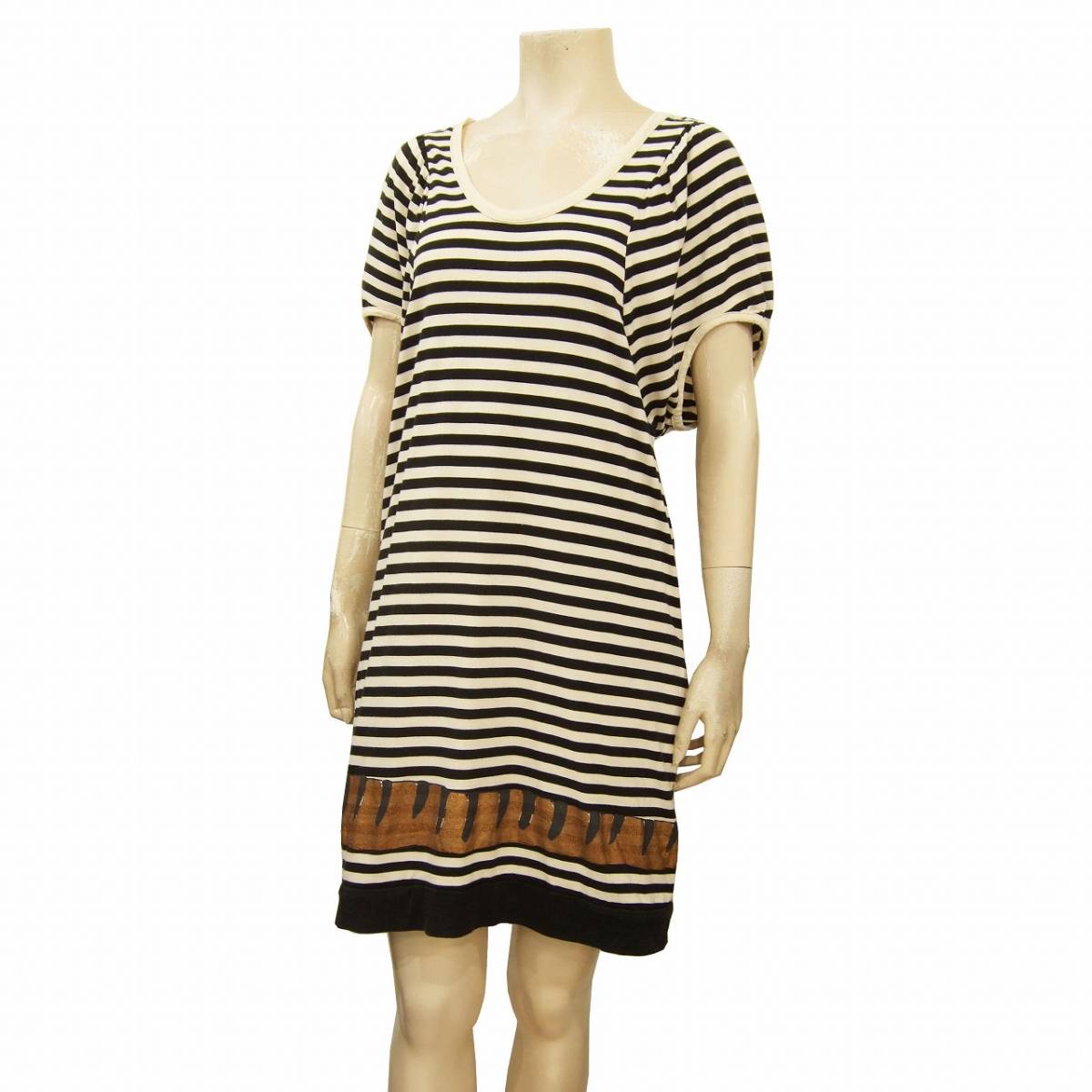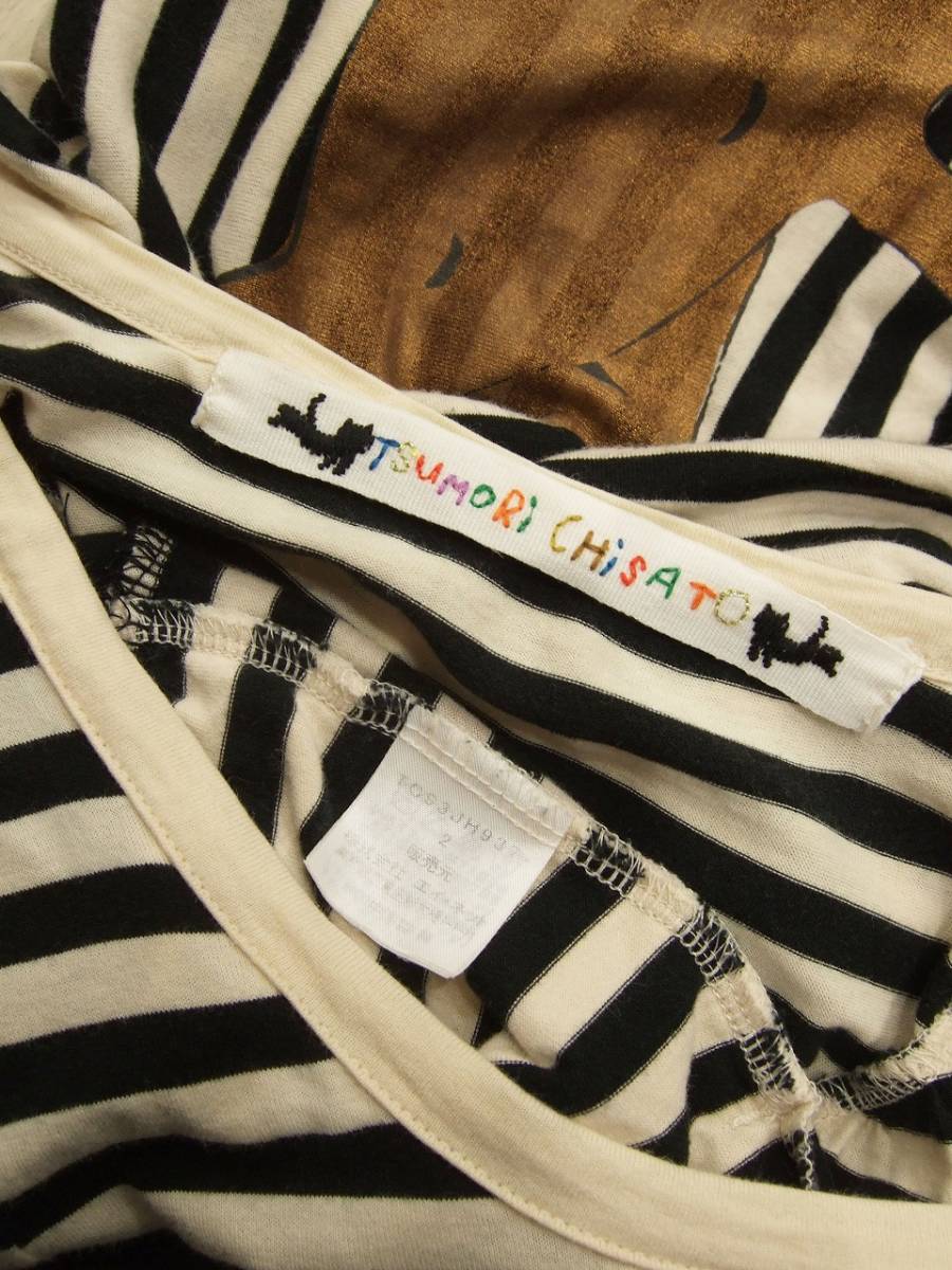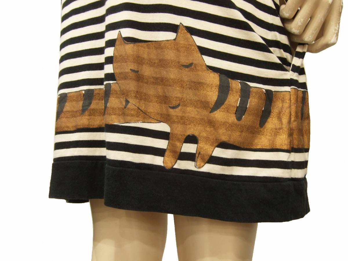 N極美品☆ツモリチサト*TSUMORI CHISATO★ベージュ*黒★ボーダー柄★ネコプリント★ゆったりカットソーワンピース★サイズ2号★レディース