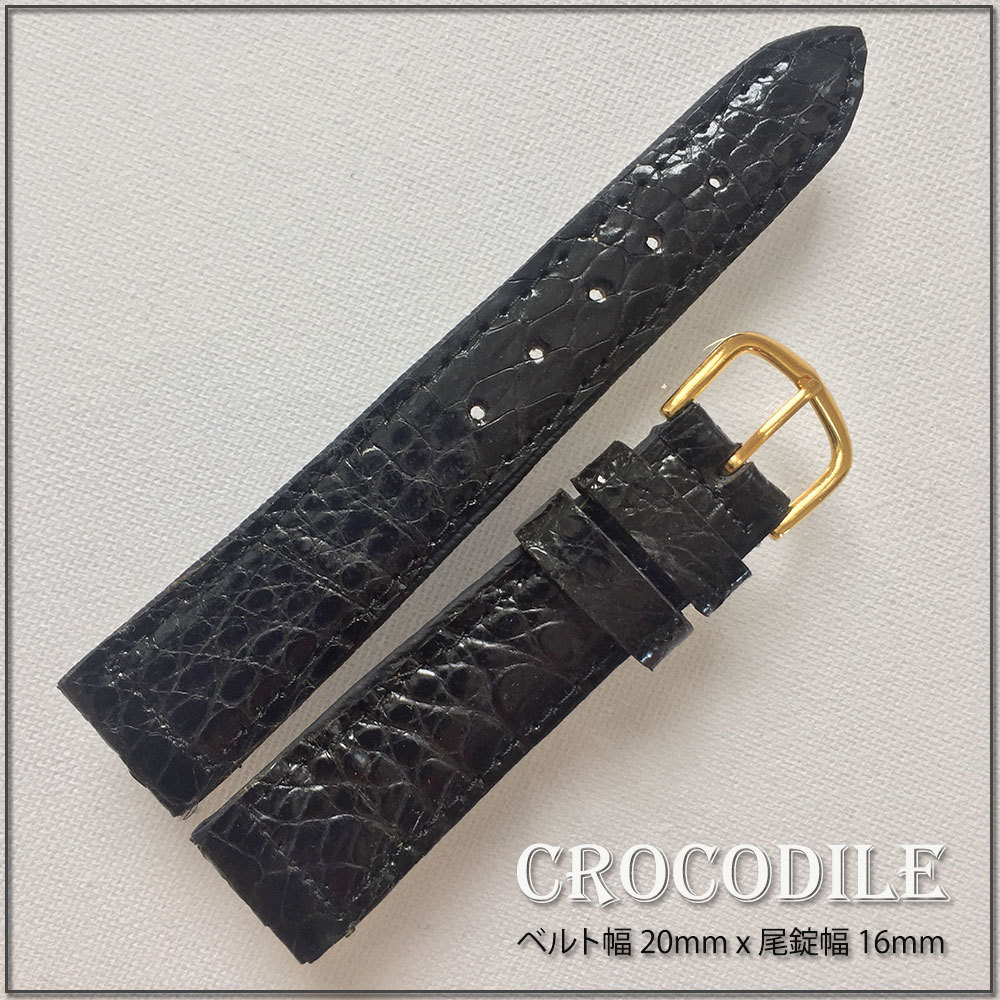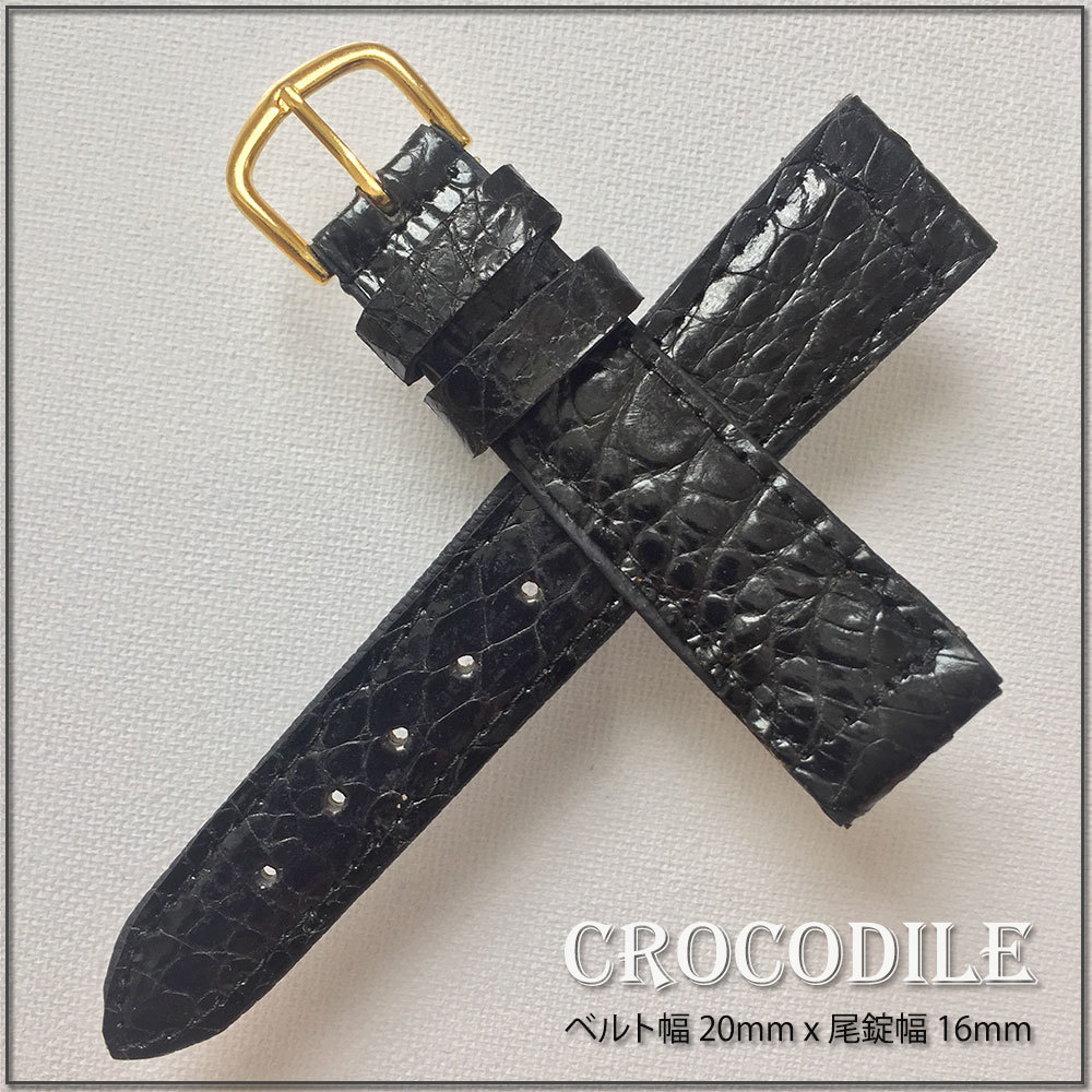 1点物 20mm WILD STYLE 本革 クロコダイル ブラック 時計ベルト 艶黒 やわらか 刻印入り ワニ革 限定 クロコ CLASSIC GOLD BUCKLE