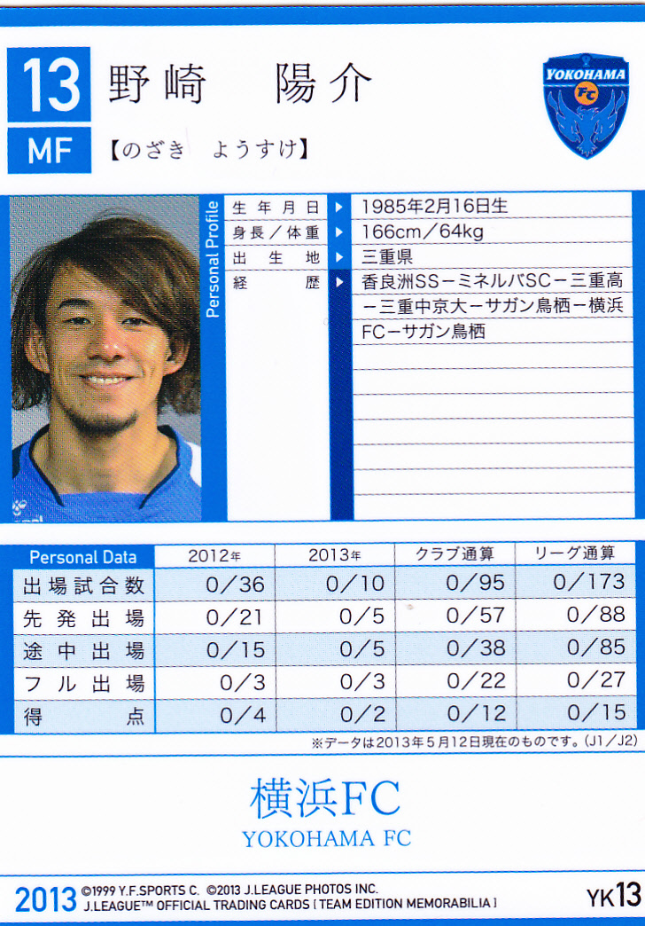 横浜FC2013 YK13 野崎陽介 Jリーグオフィシャルトレーディングカード チームエディションメモラビリア 三重高 三重中京大 サガン鳥栖