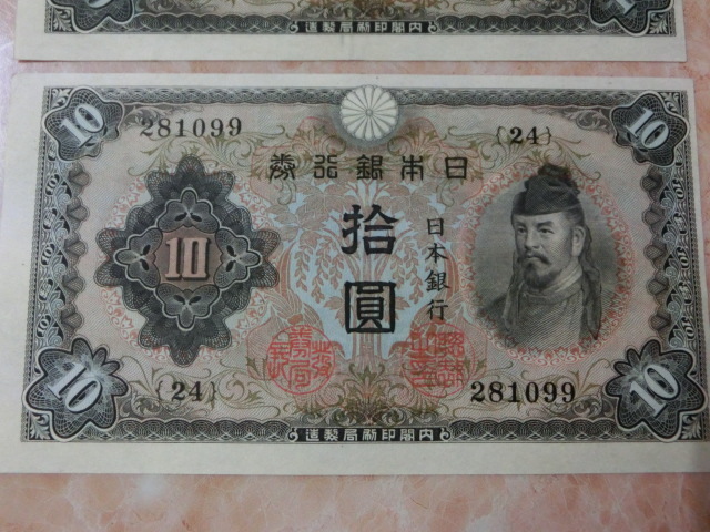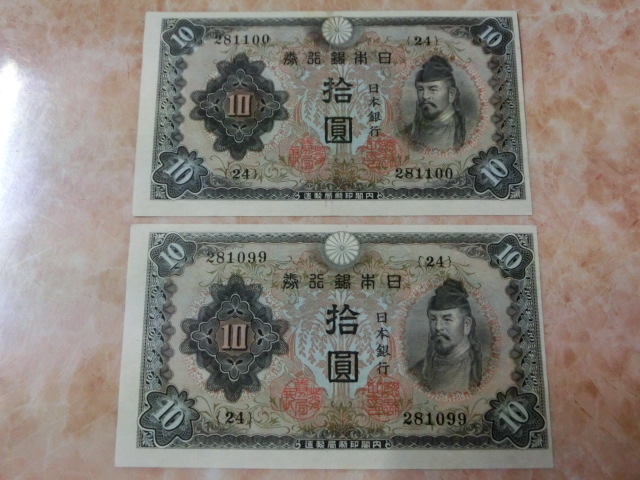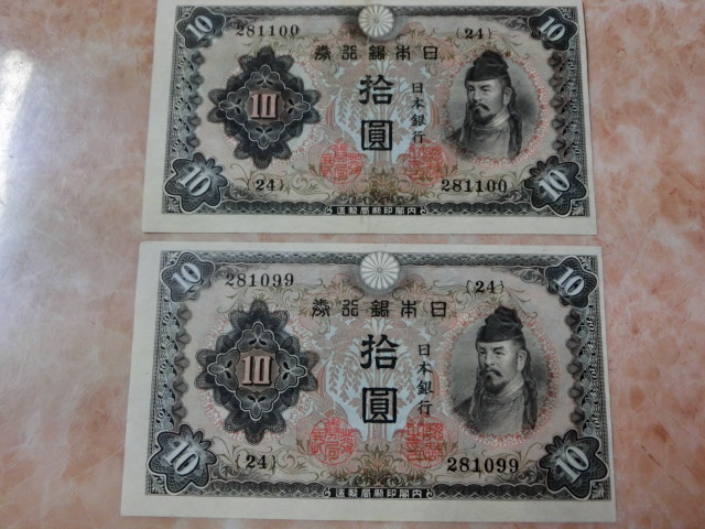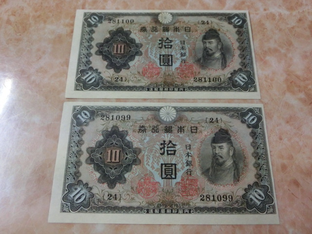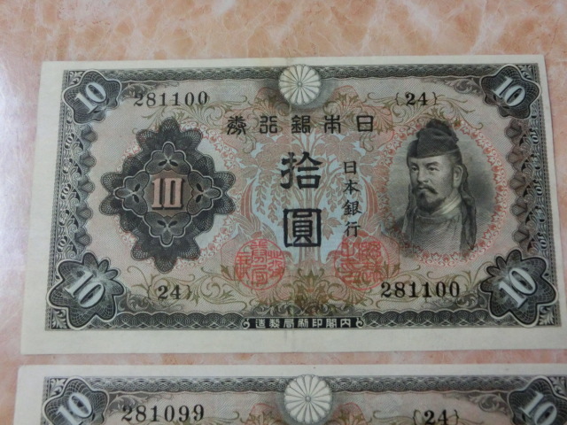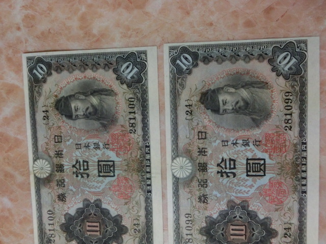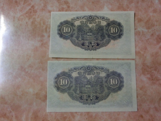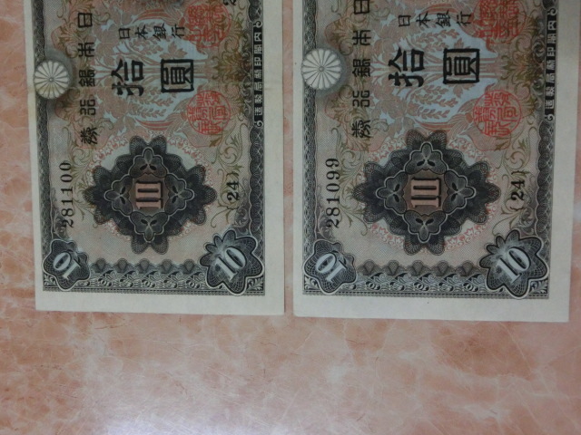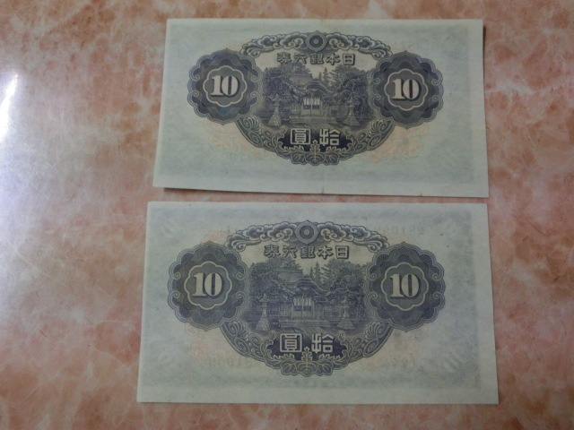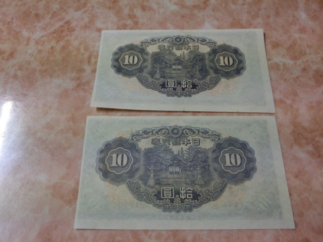 不換紙幣10円 2次10円の連番を2枚セットで裁断のズレが有ります。