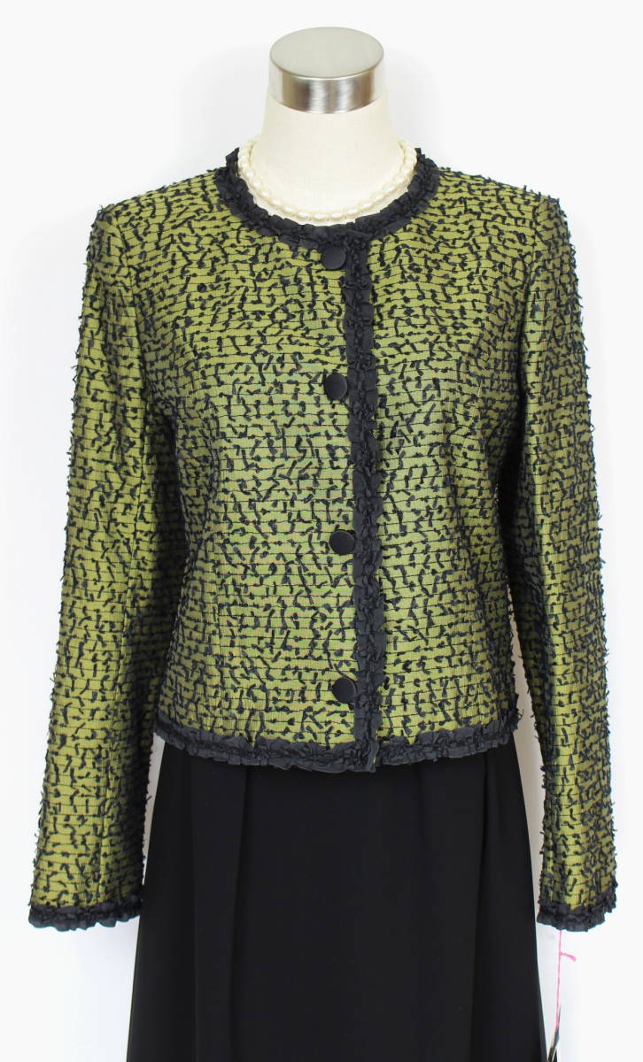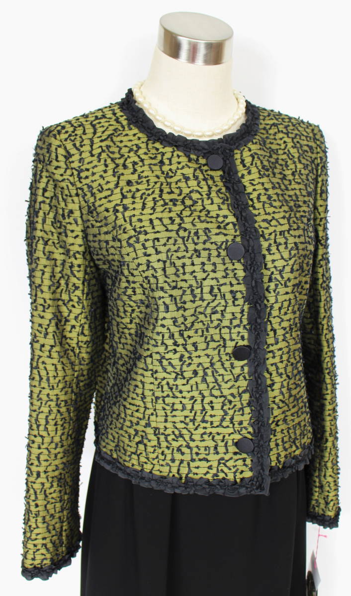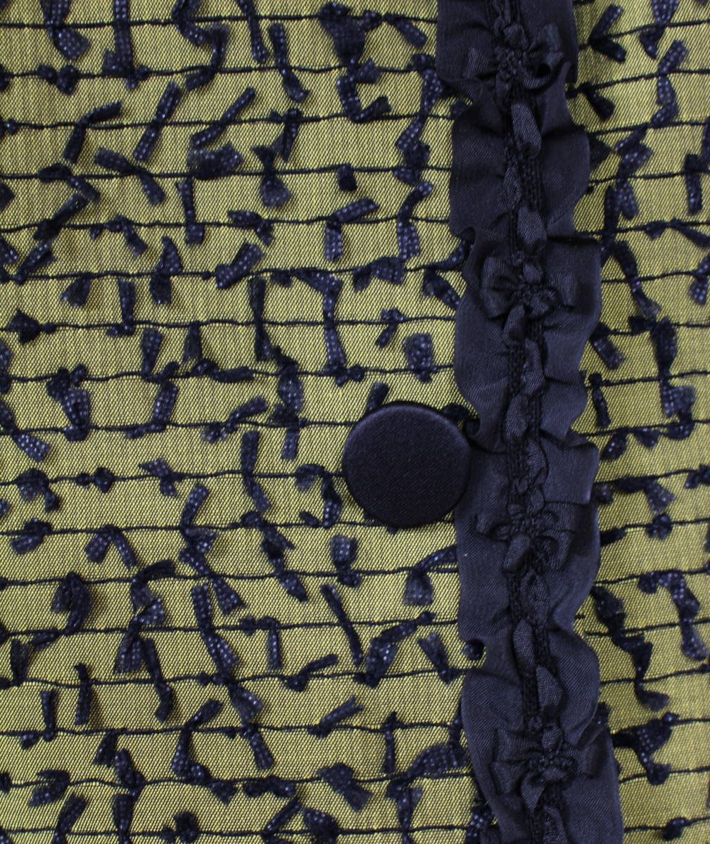 黒の小さなリボンヤーンをピラピラと縫い付けたような生地です。