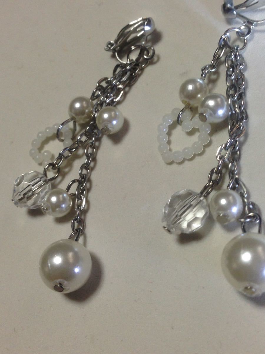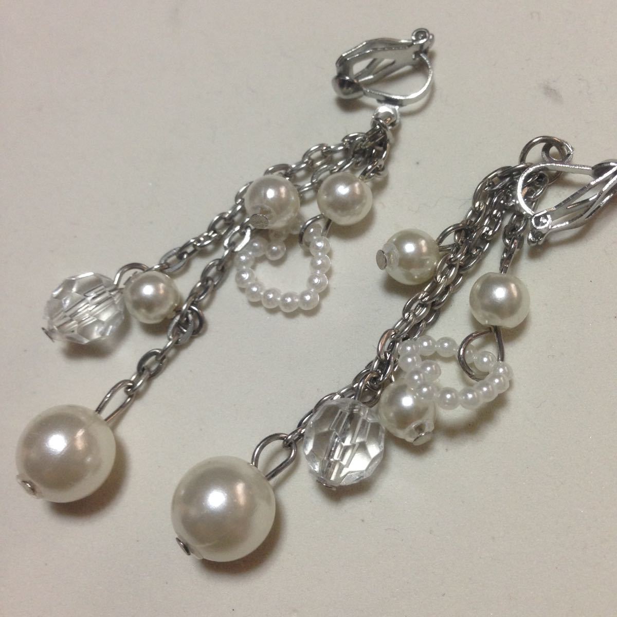 ビーズとフェイクパールの豪華なイヤリングです、サイズは55ミリ×10ミリです、様式はバネ式です
