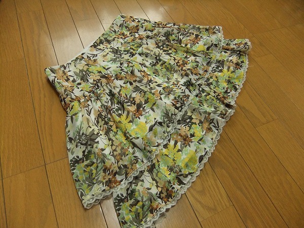 ★表記サイズ★ 1 ★実寸★ ウエスト32.5 総丈42 (平置きの素人寸法のため、多少の誤差はご了承ください) ★素材★ 表裏地ポリエステル ★お色★ グリーン系 サラっとしたシフォン生地で裏地付きです 裾レースでティアードフリルデザインです 使用感薄くキレイでよい状態です 保管しわ、used、自宅保管品をご理解頂ける方にお願い致します 自己紹介欄も御覧ください♪201407 |