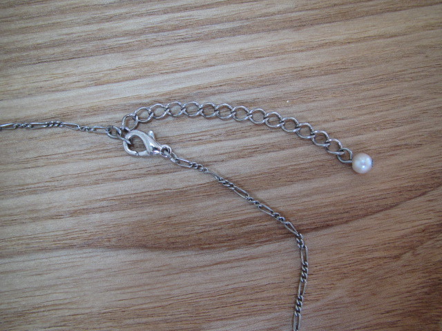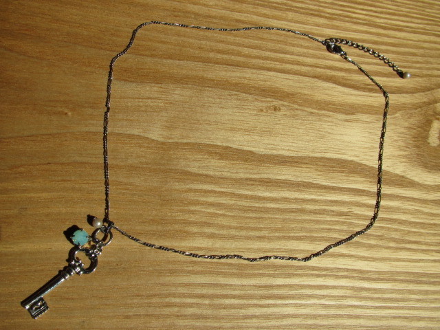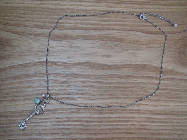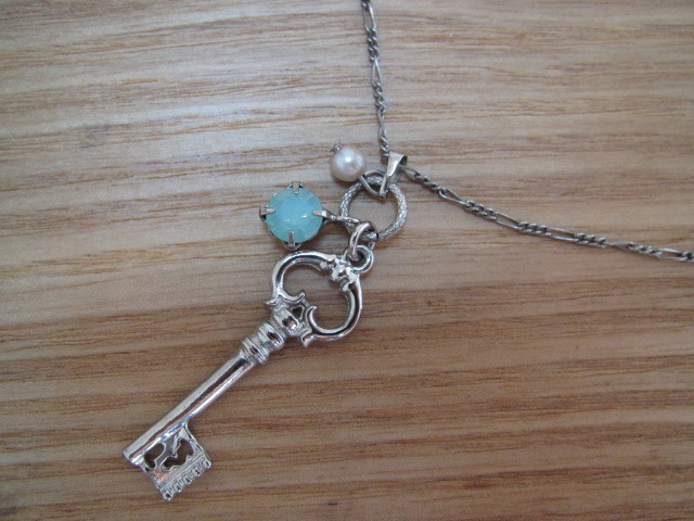 鍵のモチーフ、パール、水色の石のモチーフのついたネックレスです。