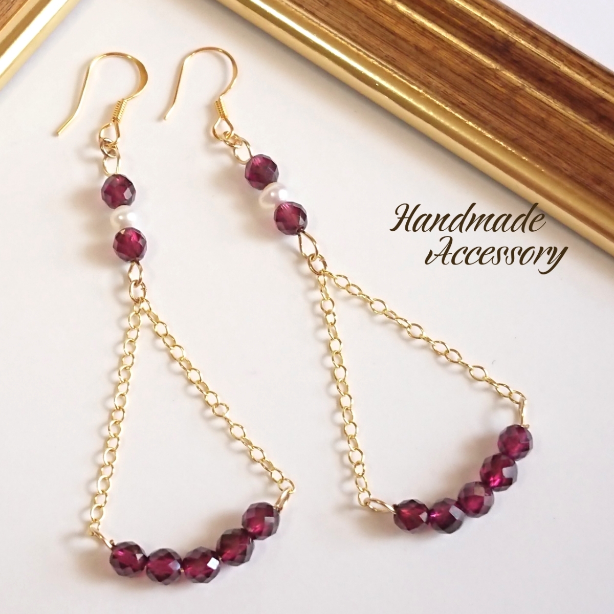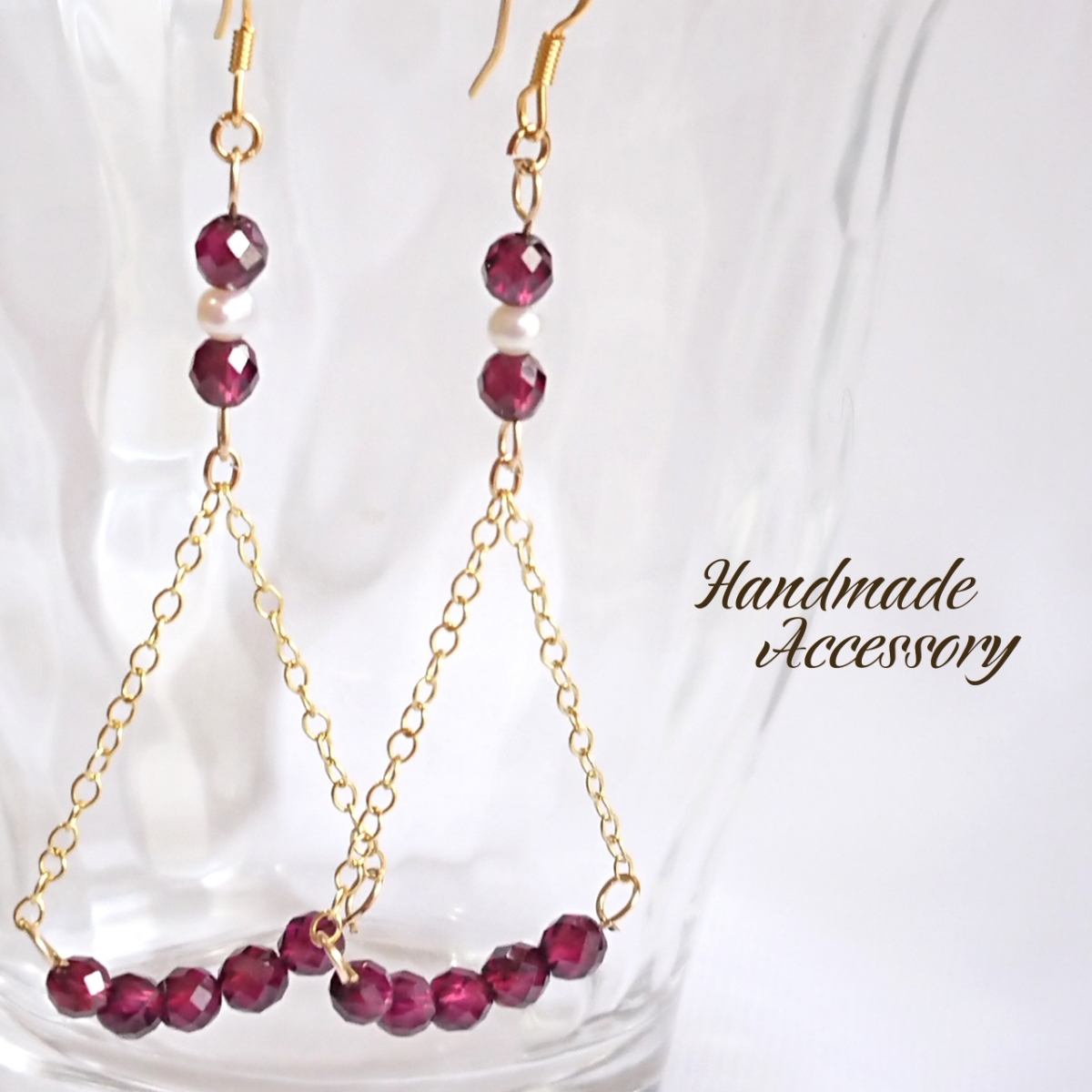 宝石質で赤紫色のインド産カットガーネットと上品なホワイトカラーの淡水真珠を組み合わせて、緩やかなカーブのラフトライアングルに仕上げたロングピアスです。