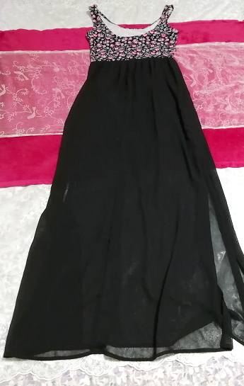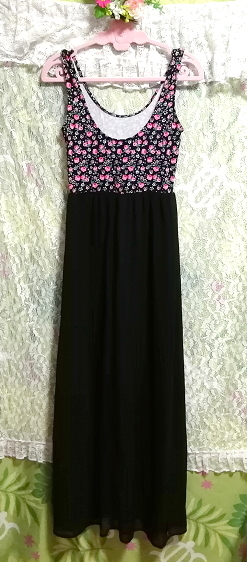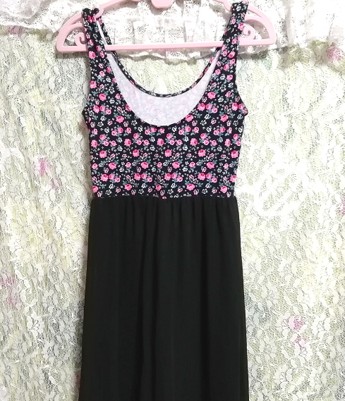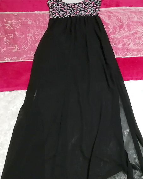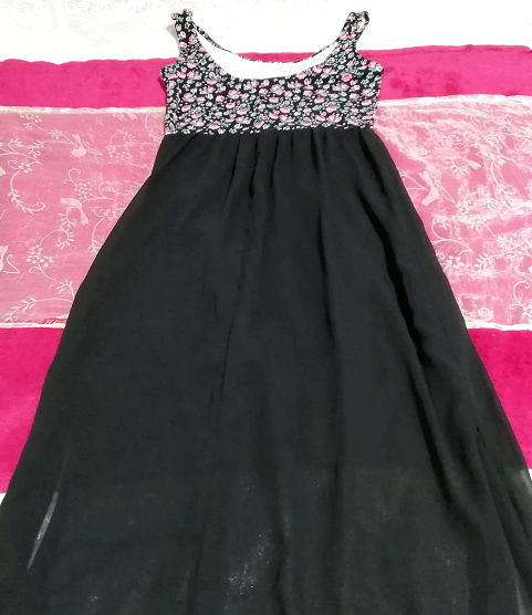 ピンク花柄トップス黒シフォンネグリジェロングスカートマキシワンピース Pink floral pattern black chiffon negligee skirt maxi dress