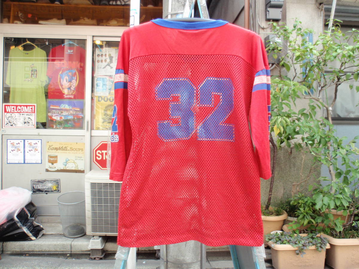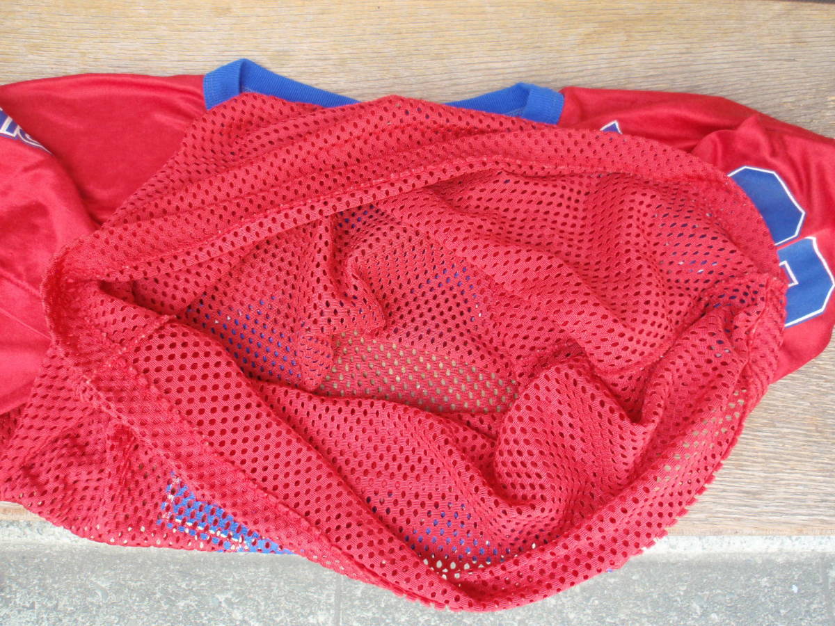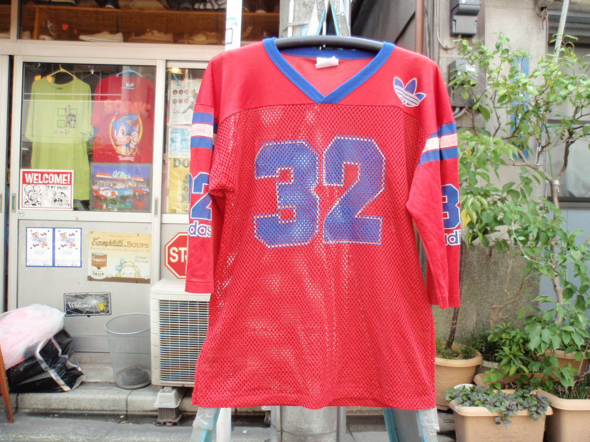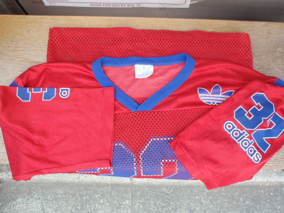 中古品ですので多少の使用感や擦れ、小さい糸つれなどありますのでご了承ください。ただ上手に使っていたので目立った酷い汚れや傷は無く十分使えると思います。US製アディダスの赤いメッシュ地なフットボールTシャツになるかと思います。サイズは表記タグが無いので確かではありませんが、実寸では平置きで肩幅59センチ、身幅54センチ、着丈68センチ位です。正規品。