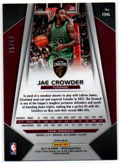 【JAE CROWDER】2017-18 Panini Prizm Prizms Pink Pulsar #196 [15/42]
