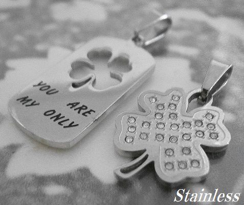 在庫処分★サージカル ステンレス製ジルコニア付フラワー&メッセージ プレート ペアペンダントset/ステンアクセALL50%OFF
