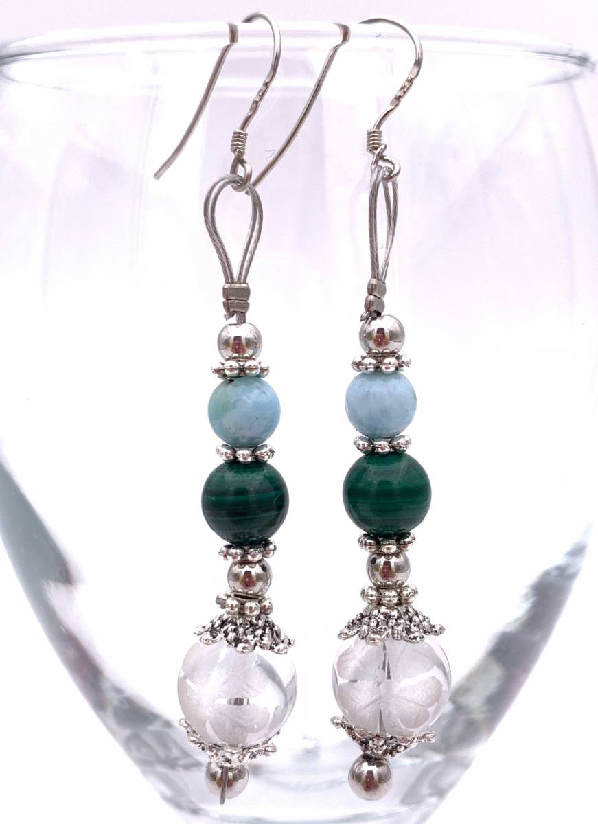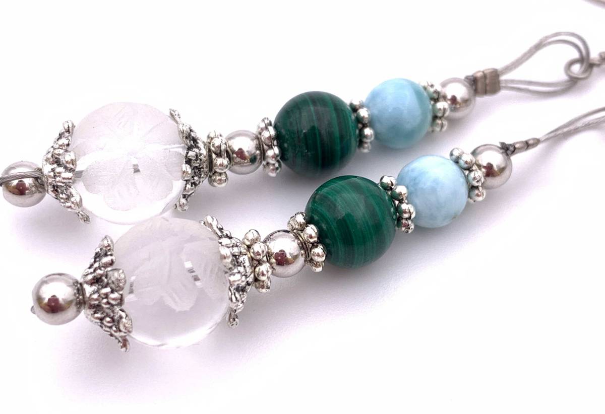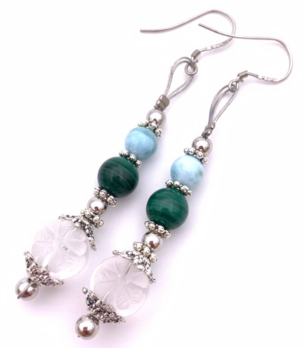 天然石手彫り水晶四葉のクローバー&ラリマー&マラカイトのピアス