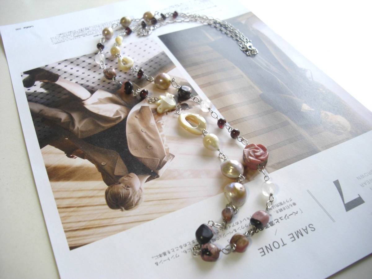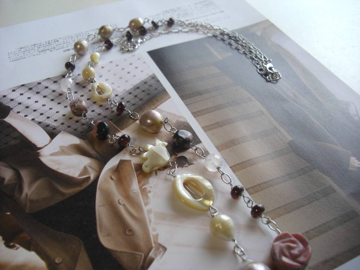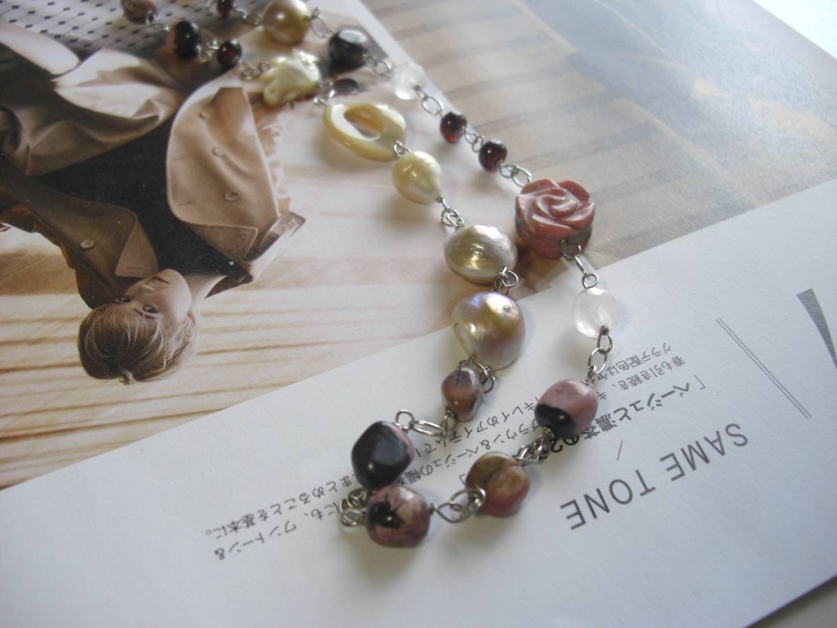パンクと女の子・・シリーズです♪個性的なバロックパールにロードナイトの薔薇やベージュシェルの小鳥さんを合わせて大人可愛いネックレスです ♪シックなベージュ系とモーヴピンクでまとめています♪9ミリから14ミリくらいまでのバ ロックパールに8ミリ位のタンブルや14ミリの薔薇のロードナイト、8ミリのローズクォーツやオーバルリングや小鳥さんのベージュのシェル、小粒のガー ネットを繋いでいます♪長さは90センチ+アジャスター13センチで全長103センチ位です♪表情かなバロックパールなのでシンプルなデザインに仕立てました♪お揃いのシ リーズも出品しています♪ハンドメイドを ご理解頂いてノークレーム、ノーリターンでお願いします