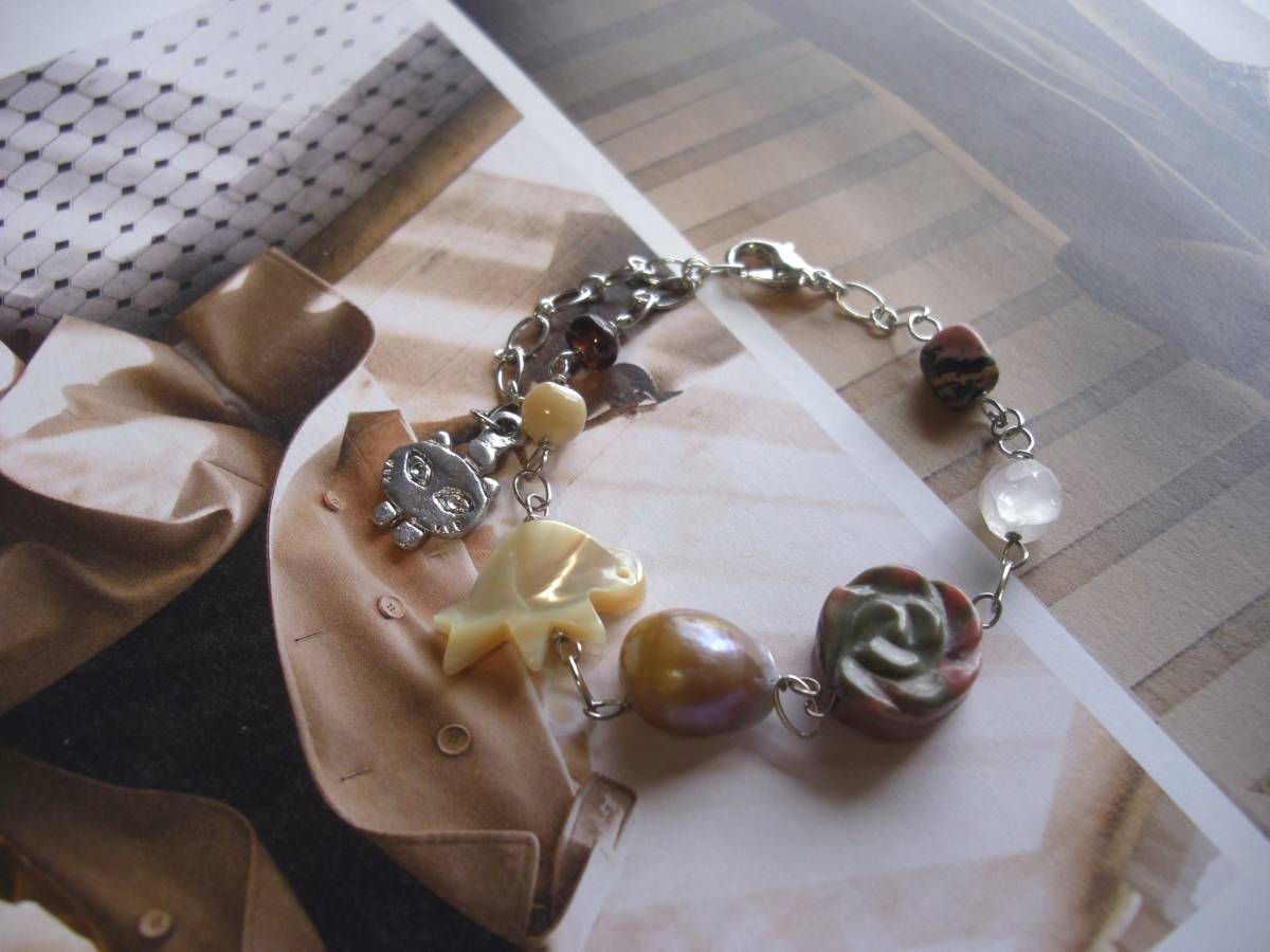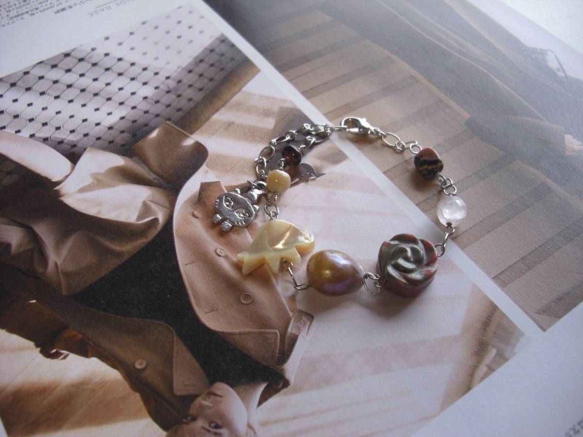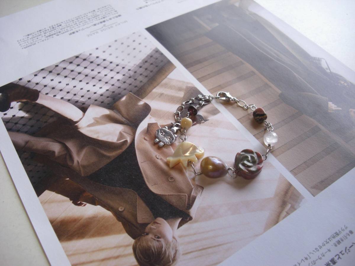 パンクと女の子・・シリーズです♪個性的なバロックパールにロードナイトの薔薇やベージュシェルの小鳥さんを合わせて大人可愛いブレスレットで す ♪シックなベージュ系とモーヴピンクでまとめています♪12ミリ位のバ ロックパールに8ミリ位のタンブルや14ミリの薔薇のロードナイト、8ミリのローズクォーツや小鳥さんのベージュのシェル、小粒のガー ネットを繋いでいます♪長さは全長23センチ位で調節自由です♪お揃いのシ リーズも出品しています♪ハンドメイドを ご理解頂いてノークレーム、ノーリターンでお願いします