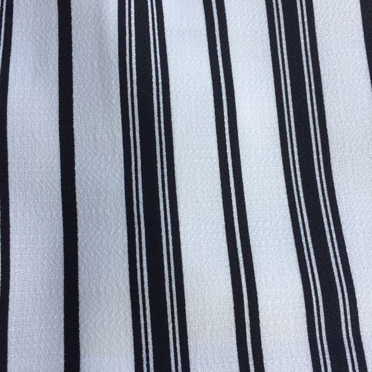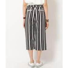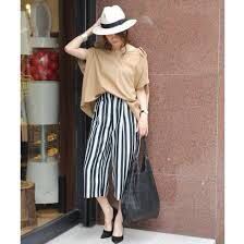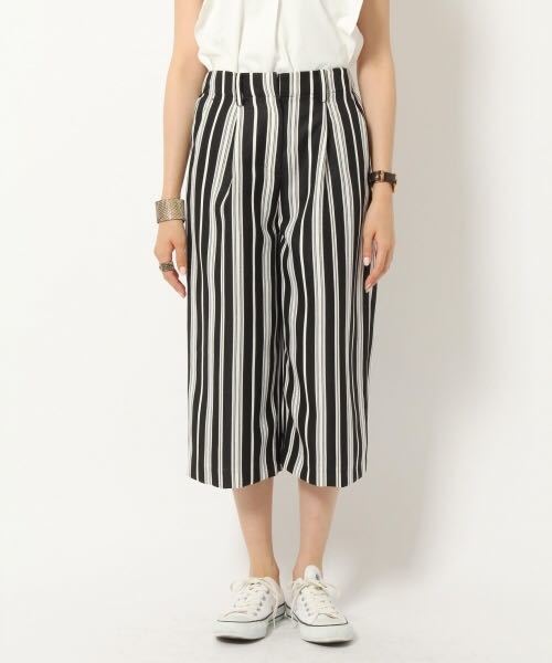 トレンドの太ピッチストライププリントを表面感のあるドビーにプリントしています。生地のツヤ感がカジュアルになり過ぎずバビロンらしいフェミニンカジュアルに。リラックス感のあるシルエットですが、ウエスト~ヒップは余計な丸み、分量を取って張って見えない様にこだわっています。前ウエストはベルト切りなしの身頃続きになっており柄が切れることなくすっきりと見えます。後ウエストはゴムではきやすく、前ウエスト内側にはヒモが通っているのでベルト無しでも調節も可能です。