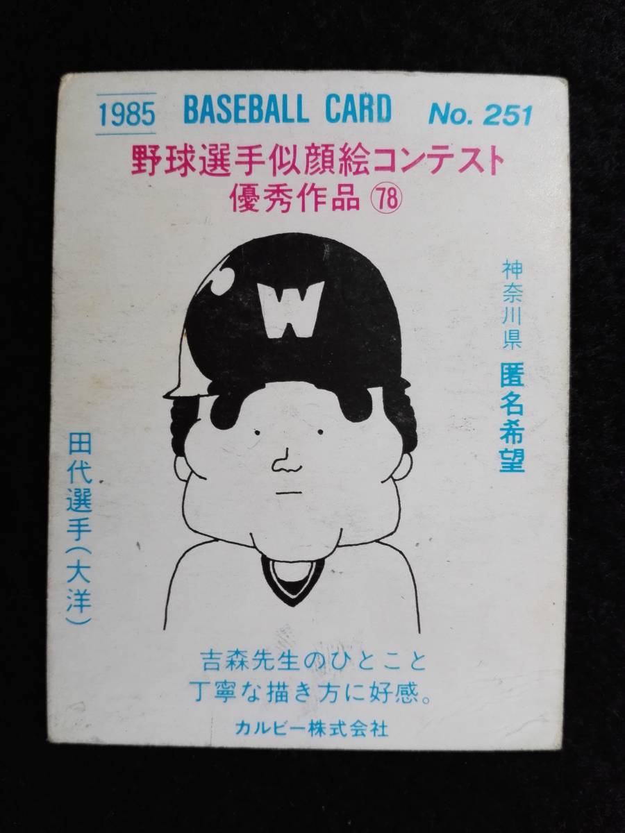 【商品説明】 こちらの商品は、1985年カルビー プロ野球スナックカードになります。 田代選手です。 経年による汚れ、スレ、シミ、 小傷、色褪せ、端々の破れ等ございます。 神経質な方はご遠慮下さい。 譲り受けたままの状態です。 白く写っているのは、光の反射に よるものです。 発送についてですが、スマートレター、 レターパックライトでの発送を予定しております。 下記の注意事項をご覧になり同意の上の方のみ 入札をお願い致します。 【注意事項】 ※ 落札後のクレームや返品は、お受け致しませんのでご了承下さい。 ※ 落札後48時間以内にご連絡が取れる方のみ入札をお願い致します。取れない場合は、落札者の都合により削除させて頂きます。 ※ 新規の方の入札は、ご連絡されて下さい。入札をお断りさせて頂く場合がございますのでご注意願います。また評価の低い方やマイナスが多い方の入札は、こちらから削除させて頂く場合がございます。 ※ 経年による汚れ、小傷等ございますので細かい所が気になる方は、ご遠慮下さいませ。 ※ 気になる所や疑問点などございましたら必ず入札前に質問メールにてご質問されて下さい。 ※ 質問メールにメールアドレスや電話番号など記載されていた場合は、お答え致しません。(お答えした場合公開される為) ※ 仕事の都合上ご連絡が遅くなる場合がございますのでご了承下さい。
