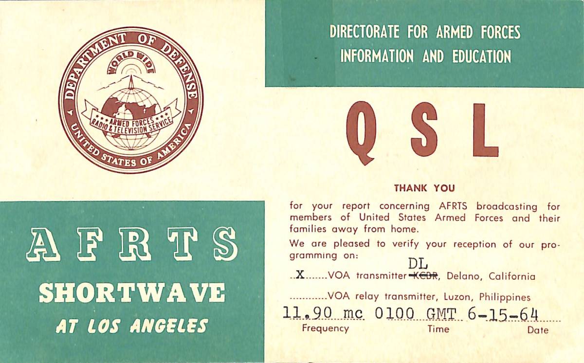 【商品名】・・・AFRTS(★米軍放送)のベリカード。 【コメント】・・・日本での米軍放送は、FENが有名ですね! 【国名・地名】・・・アメリカ合衆国★カリフォルニア州・デラノ。 【受信データ】・・・1964年6月15日・SW11900KHZを受信。 【記載事項】・・・受信データのみ記載。 【状態】・・・シワ、汚れ、シミ、焼け、テープ跡、色あせ等があります。 ■カードの状態は★画像を参考に判断して下さい。 ■この機会にぜひこのベリカードを貴方のBCLコレクションに加えて下さい! | |