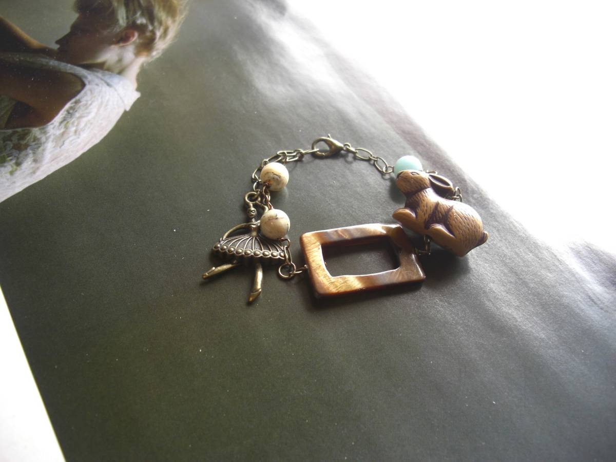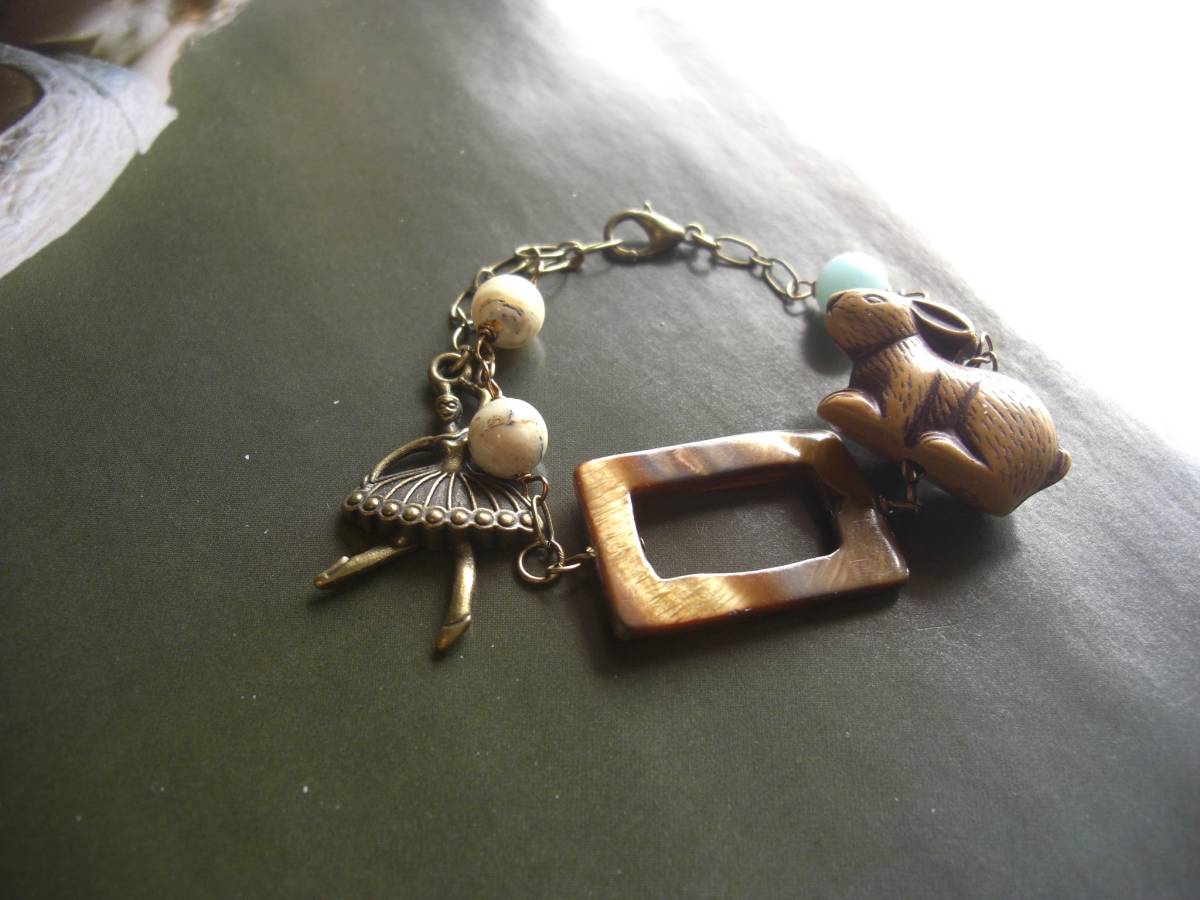 愛らしさを繋いで・・シリーズです♪アリスの夢・・シックなアマゾナイトやタイガーアイ、アフリカンオパールを合わせたブレスレットです♪樹脂のスクエアリングやうさ ぎさんを合わせてロマンチックな表情です♪アマゾナイト、タイガーアイ、アフリカンオパールは8ミリの丸玉、スクエアリングは3×2センチ、うさぎさんは 18×25ミリ位です♪長さは全長24センチ位で調節自由です♪お揃いのネックレスも出品しています♪シンプルで飽きのこないいつまでも着けられるデザインを考えて作り ました♪ハンドメイドをご理解頂いてノークレーム、ノーリターンでお願いします