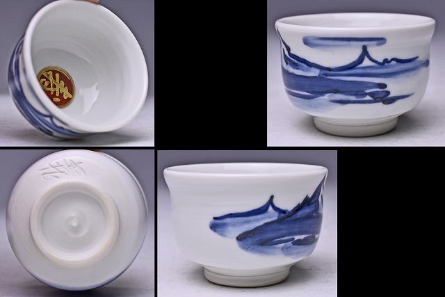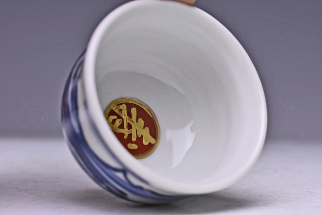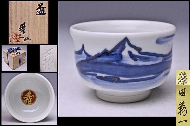 篠田義一 ★ 染付山図赤絵金彩寿字ぐい呑 ★ 共箱栞 ★ 師: 人間国宝 近藤悠三 ★ 北アルプス 常念岳 日本百名山 ★
