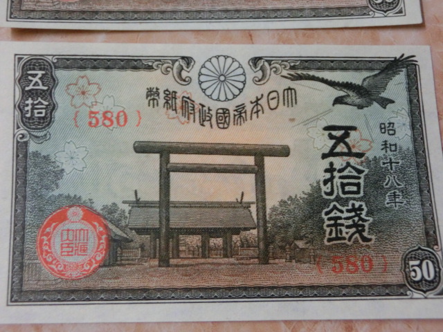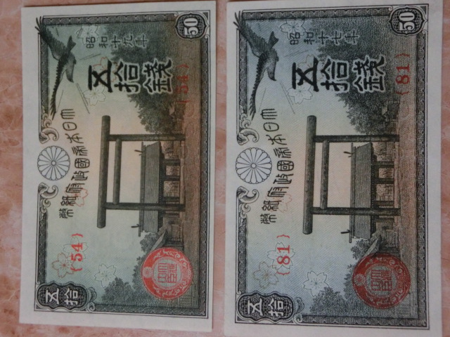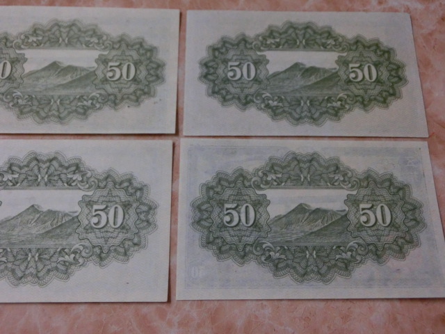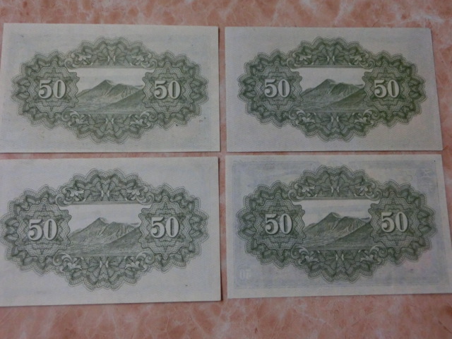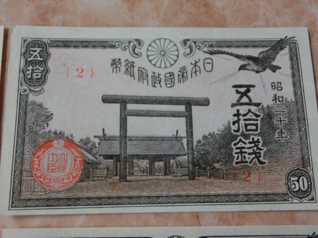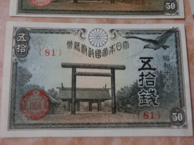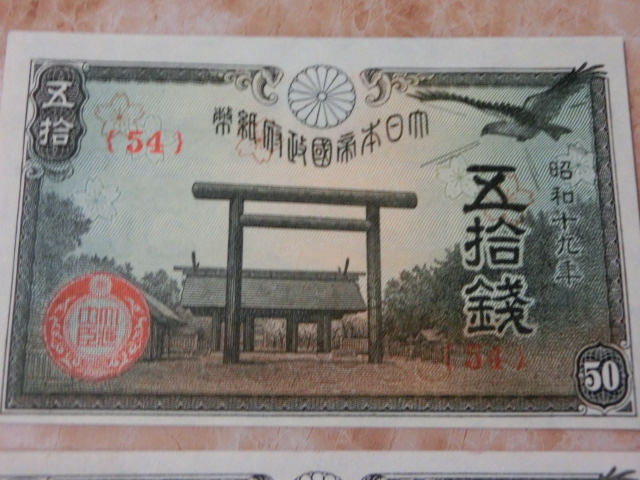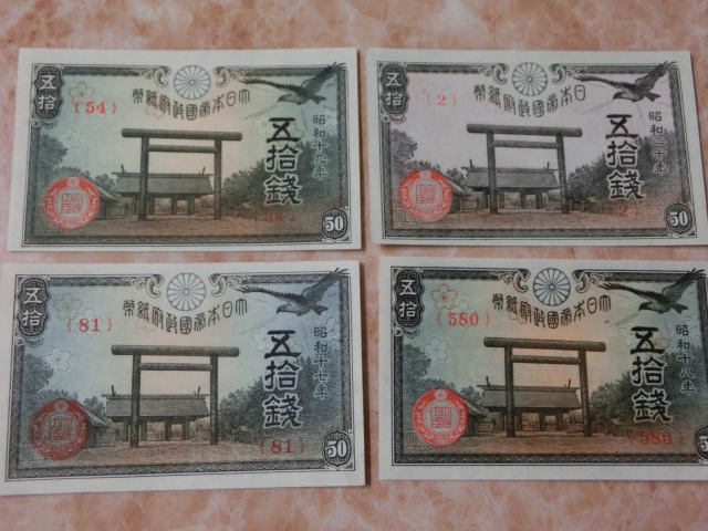 政府紙幣 靖国50銭の17年・18年・19年・20年の未使用~準未使用を4枚セットです。