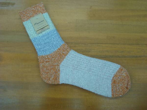 新品Mauna Kea(マウナケア)ソックス5段切り替えブークレーボーダー MENS Orangeです、パイル生地で5段切替えの非常に雰囲気がいい商品です!正式名は→5段切り替えブークレーボーダー MENS 106803、正式カラー名は→Orange、素材はCotton 75%Hemp 15%Nylon 10%です!サイズは25-27cmのワンサイズです!まだお知りでならない方にソックスブランド mauna kea (マウナケア)の説明です!もとは足袋や素足の文化だった日本に、靴下が普及しはじめたのは明治時代。文明開化とともに洋装が一般化し、革靴に合わせて履かれるようになった。そうした需要を受け、明治後期より靴下の生産が盛んになったのが奈良県広陵町である。江戸時代より綿花と木綿の産地だった広陵町は、その背景を活かして海外より靴下用の手回し編み機を導入。大正時代には自動編み立て機も導入され、米作農家が農閑期に行う副業として広まった。戦後の最盛期には、地元の組合に200軒以上の靴下工場が加盟していたという。現在でも国内で生産される約6億本の靴下のなかで、日本有数の靴下の産地である奈良県広陵町はシェア約4割と日本一を誇っているのです。mauna keaで使用しているのは多彩な色糸とネップが不均一に混ざった杢糸。機能性と天然素材にこだわり、吸湿性と速乾性を兼備させるためにコットンにヘンプを混紡した素材です。厚手の生地ですので丈夫で抗菌消臭効果もあり汗を吸収する素材と水分を発散する素材を混合しているので、蒸れにくく爽快な履き心地がオールシーズン持続します!またゴム部分の締め付けを一箇所に集中させず、ゴムの範囲を広くとることでゴムの締め付ける力を分散しています。この結果ゴム部分が蒸れにくく、痒みなどのお肌へのストレスの軽減、 また、ズレの防止効果を実現しました。靴下は筒状に編まれるのですが、編み機の特性上、径の太さは一定になります。そのため、パターンで履き心地を出すには限界があり、編み目と糸の太さが重要になってきます一般的な編み機で靴下を製造する場合、その針数が170本~180本なのに対し、日産80本ほどと規模は小さいながらも、25年以上も前から稼動し続けるこの編み機はその3分の1である60本です。針数60本の靴下は、一般的な180本の編み機よりも編み目に余裕があり、糸も通常より太いものを使うことができる。つまり余裕のある編み目がそれぞれの足のカタチに沿うため、とても履きやすい靴下になるというわけです。編み機が古いものなので日本国内にはほとんど残っていませんが、ザックリとした編み目はこれでしか再現できません。麻と綿の微妙なバランスそして土踏まずを刺激するサポーター履き心地は抜群に良くこの混率が汗を吸い外へ出しあの嫌なベタベタ感が無く何時でもサラサラで快適また丈夫で長持ちも致します。現在は吸湿速乾性をうたった化学繊維の靴下などもありますが、それは天然素材が本来もっている機能を再現したにすぎず、ウールやヘンプでもその特性をうまくコントロールすれば十分快適な靴下はつくれるんです。靴を脱いだ時、こんな靴下はいてたら、素敵じゃないですか?たかが靴下!されど靴下です!色の方は、各パソコン、デジカメによって多少異なりますので、ご了承下さい、ノークレーム・ノーリターンでお願いいたします。ご質問に関しましては、火曜日を除く、午後12~午後9(21)時までに、お早めにお願い致します。この商品以外も、その他、色々出品しておりますので、是非ご覧下さい。