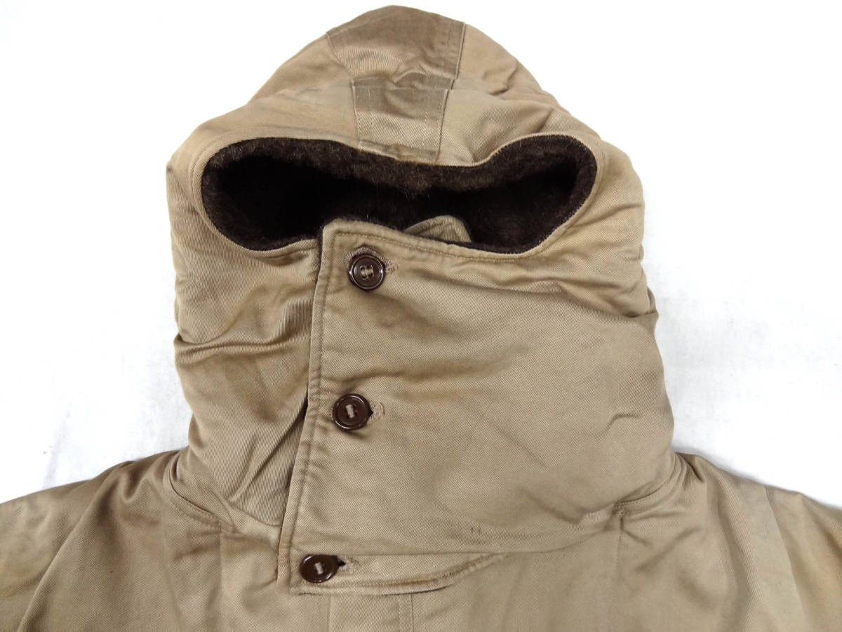 生地はしっかりとしたキャンバス地です。アルパカライニングは胸元までしかありません。首元は完全に開閉はしないように四角く縫ってあります。襟を立てることが可能で,さらにフードをかぶってチンストを留めることで防寒暴風対策が出来るというこれ以外では見たことがないデザインです。推測するにこれだけの防寒対策をする必要があったコートだということがわかります。