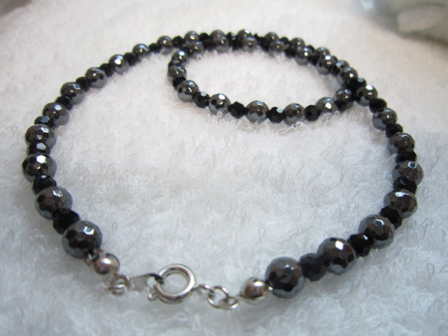 ★★★画像はヘマタイト石の6㎜のカットタイプとガラスビーズ玉の4㎜カットタイプを組み合わせてデザインしたお洒落なネックレスです。★★★ ★★★ネックレスの長さはフック部分を合わせて約42㎝です。首もとをシンプルに飾るお洒落で高級感溢れる商品に仕上がっております。★★★ ★★★すごくお洒落で綺麗な商品です。★★★ 【ヘマタイトとは】 ヘマタイトは和名で赤鉄鉱と呼ばれている通り、鉄鉱石のひとつです。密度が高く硬く結晶した酸化鉄で、鉄の含有量が約70パーセントを超えるもっとも重要な鉄鉱資源となっています。 ヘマタイトのなかでも光を反射するほど綺麗に結晶するものがあります。「鏡鉄鉱」といい、宝石として、大きく結晶したものなら彫刻の素材としても利用されます。 【ヘマタイトの意味】 ヘマタイトの語源は、ギリシャ語で「赤い血、血に似ている」を意味する「haimatitis」からきています。前述した通りヘマタイトは酸化鉄ですから粉は赤く、顔料としても利用されました。そのことから、血と生命力を象徴する石として考えられたようです。 また、人類の歴史に鉄器が現れると、戦争でも青銅に代わり鉄製の武器が作られました。血と武器と戦場という繋がりから、ヘマタイトが「戦いと勝利」という意味を持ったのも頷けます。 ヘマタイトは生命力と勝利を象徴し、戦いの守護石として古い歴史を持ったパワーストーンなのです。 【ヘマタイトの効果】 ヘマタイトは血液に力を与えることで、身体能力を高めてくれます。ヘマタイトは身に着ける人の血液に力を与えるエネルギーを持ちます。赤血球の働きを活性化し、全身への酸素供給量が高まることから、運動能力を高める効果や肉体労働をされている方には持久力を高める効果を持ちます。脳も活性されます。 ヘマタイトは直接血液に働きかけるストーンで、血液がドロドロで改善したい人、健康になりたい人におすすめです。血液がサラサラになるということは、健康であるための条件の一つでもありますから、体調もよくなります。持っておいて損はないパワーストーンです。 血液の流れがよくなると運動能力が高くなるのでスポーツマンや、日ごろ肉体労働をしている人には非常におすすめのアイテムです。また、体力を増加させる効果があるので、体力の無い人、病気がちの人にもおすすめです。体を動かさない人はヘマタイトを身に着けてウォーキングなどに行くとよいでしょう。ヘマタイトが体を動かし、筋力をつけるキッカケとなってくれるはずです。 【ヘマタイトのヒーリング効果】 〇意思を強くする (最後までやり遂げる意志の強さを得る) 〇生きることへの欲求を強める (生きる力を強める) 〇勝負のお守り (勝負運を高める) 〇健康増進 〇運動能力強化・向上 〇仕事運を高める 〇恋愛成就 〇過酷な運命を跳ね返す強さ (忍耐と根性、困難に立ち向かう勇気) 〇勝利へと導く (勝利と栄光を掴み取る) 〇血液に力を与える 〇判断力・決断力を高める 〇自立心・独立心の向上 〇魔除け厄除けのお守り 【ヘマタイトの体の症状への効果】 出血、炎症、生理不順、生理痛、貧血、冷え性、血液、鉄分の吸収、赤血球、腎臓、足のけいれん、眼の充血、循環器、解毒、肩こり、低血圧、めまい、手足のむくみ、電磁波の障害を吸収 ☆☆☆☆☆ヘマタイトの大きなエネルギー的特性として、持つ人の意思の力を強め、勝負強さを発揮する助けとなることがあげられます。 ヘマタイトをブレスレットやネックレス等として身に着けることで、脳の酸素活用をしやすくし、頭が冴えたり眠気を防いだりする効果もあるようです。 自分の意思を高める効果もありますから、これから本番を迎えるというときにも強い威力を発揮してくれます。緊張して本番では良い結果が出せなかった人、どうしてもこの試合や商談だけは外せないという人は、ぜひヘマタイトを身に着けてその効果を実感してください。 良い方向へ導いてくれるパワーストーンですから、勝負事が常にある人にもおすすめです。精神的にも強くしてくれるので、自分の判断力を高めてくれます。 過酷な運命やトレーニングに負けない精神的強さを養う石であり、経営者やスポーツ選手などにおすすめの石です。 ヘマタイトは心身ともに健康へと導いてくれる石ですので、もちろん一般の方にもおすすめの石です。☆☆☆☆☆ 【ヘマタイトのお手入れ (浄化方法)】 ヘマタイトの浄化法でもっとも気をつけるべきは水と塩です。 ヘマタイトの主成分は鉄ですから、塩分と水分はサビのもと。磨き上げた表面があれてしまいます。もし塩や水がついてしまったら、丁寧に拭き取っておきましょう。 同様にブレスレットやネックレスのようなヘマタイトのアクセサリーを身に着けた場合に、汗や脂がついたら必ずきれいで柔らかな布で拭いてください。 また、太陽光の場合は長時間出しておくとヘマタイトが非常に熱くなる可能性があります。熱を持つと表面