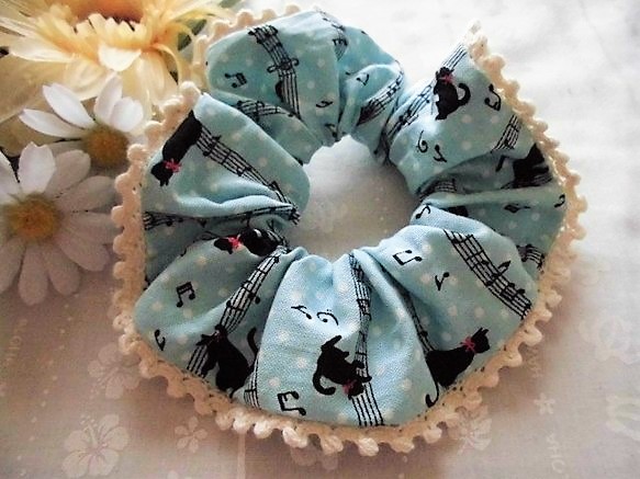★シュシュ★ 黒猫のタンゴ♪ネコ♪音符♪ミントブルー♪
