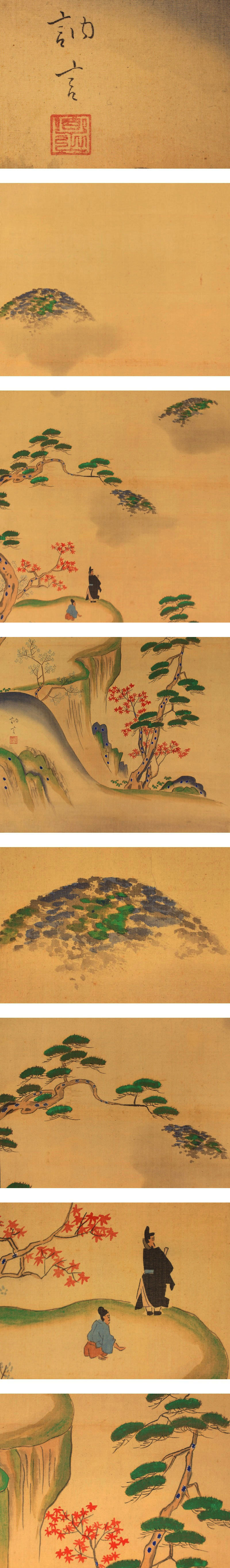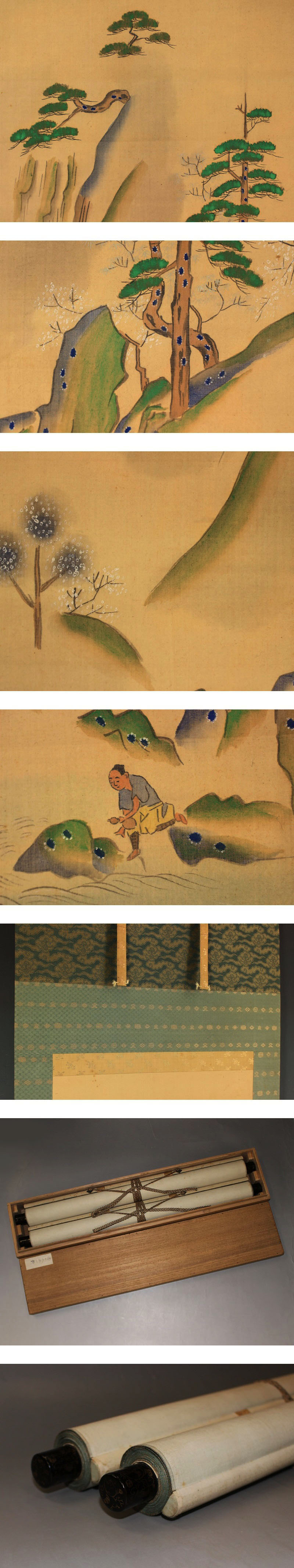 田中訥言 たなか-とつげん (1767-1823) 江戸時代後期の画家。 明和4年生まれ。尾張(おわり)(愛知県)の人。京都で土佐光貞(みつさだ)にまなぶ。法橋(ほっきょう)。古画の模写をとおして古土佐派の技術を研究,復古大和絵派の祖といわれる。門人に浮田一蕙(いっけい),渡辺周渓。文政6年3月21日死去。57歳。名は敏。字(あざな)は虎頭。別号に得中,過不及子。 本紙は、染み、汚れ、軽い折れ、皺、ヤケがあります。 表装は、染み、汚れ、軽い皺、桐箱に破損部分があります。 【サイズ】 作品 横約41cm×縦約114cm 表装 横約54cm×縦約197cm |