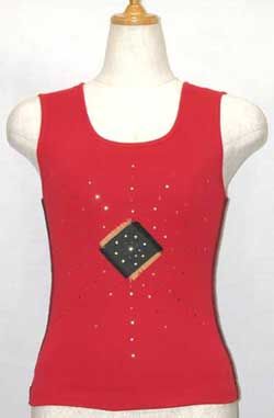 そしてそのデニム地の上と前身頃の上に光沢のあるパッチを放射状に貼りつけてあります。