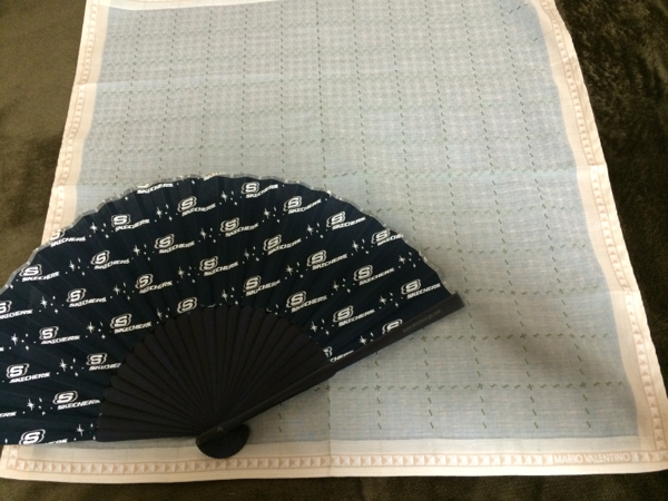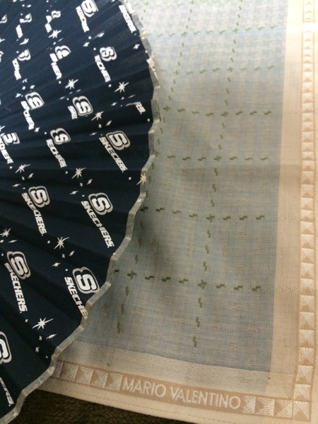 とても素敵な、綿100%綾織チェック柄MARIO VALENTINOハンカチ(約47×46cm)&SKECHERS布製扇子(幅38丈21cm)、共に未使用のお品です!新品ではありませんので、詳細はご了承ください!