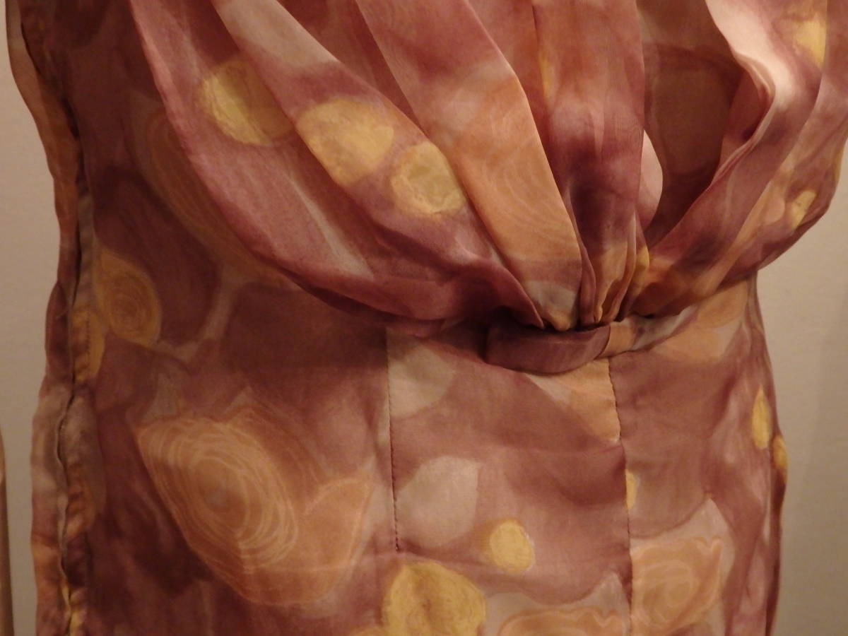 詰まったボートネックのフロントと、羽根のようなプリーツデザインのバックスタイルの対比が印象的