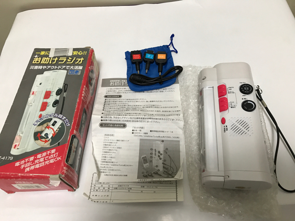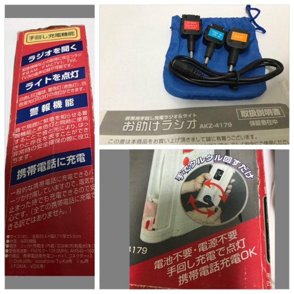 あると便利な、手回しで動く携帯充電&ライト&ラジオ。サイズ等は画像にてご確認をお願いいたします。パッケージに汚れや痛みがあるためお安く出品いたします。予めご了承の上ご入札をお願いいたします。