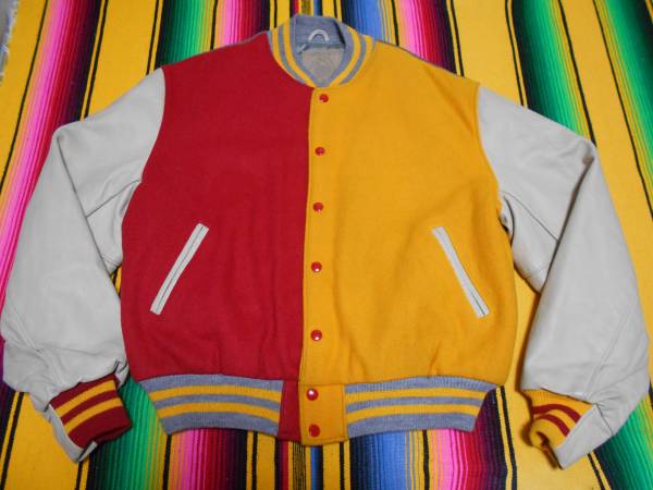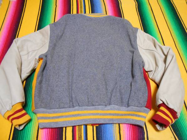 極めて珍しい 「からし」 マスタードイエロー × バーガンディ × グレーの3面マルチ 切り替えしの絶妙なカラーリング、ダメージを受けやすいスリーブリブ先端のレザー補強、良質レザースリーブ 等等  カリフォルニア カレッジ アスレティックカジュアルを彷彿させる極めて良い風合いのジャケット