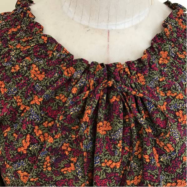 小さな小花模様です。襟ぐり、袖口、裾にゴムが入っています。