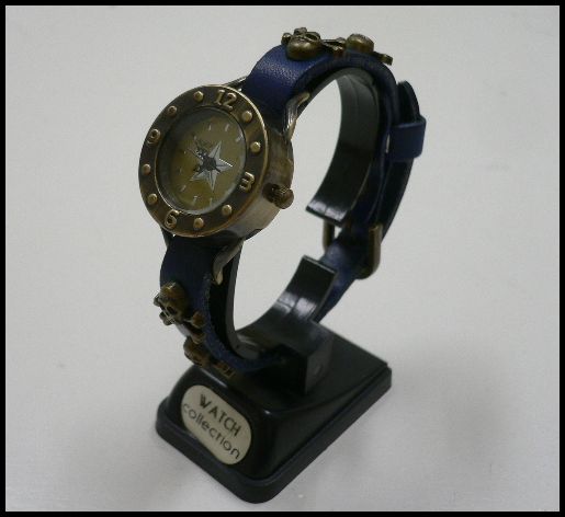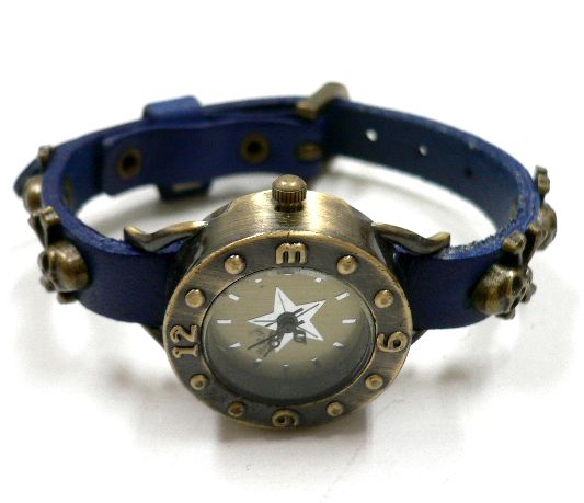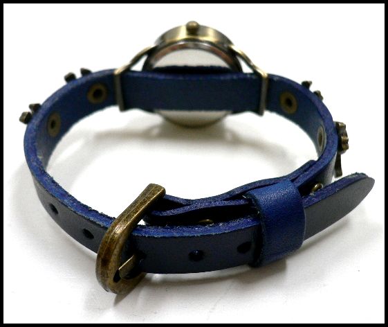 牛革スカル髑髏スタッズ レザー ブレス ウォッチ ブルー/1点のみ
