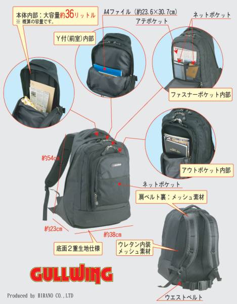 | ★ガルウィング GULLWING 本体容量約36リットルの特大デイパック 仕分けに便利なポケット類 軽量・大容量 ウエストベルト付きでホールド感もバッチリ 【バッグインフォメーション】 ◆サイズ : 横幅38×高さ54×厚み23センチ ◆素 材 : ポリエスター ◆カラー : (01)クロ・(03)コン ◆本体正面 : ネットポケット、ファスナーアウトポケット、ファスナーポケット ◆ファスナーポケット内部 : アテポケット、2分割ネットポケット ◆その他の仕様 : ウエストベルト付 ◆重 量 : 約920g ◆生産国 : 中国 ※ 予告なく仕様変更する事がありますのでご了承下さい。 使用上のご注意 ■この製品は一般的なレジャー用として 開発された商品です。 そのため書籍などの重量物を過度に収納されますと 破損の原因となりますのでおやめください。 ■直射日光や過度に高温になる場所に長時間放置されますと 退色や変形の原因になりますのでお避け下さい。 ■本品の洗濯、アイロンの使用はご遠慮ください。 ■火のそばに近づけないでください。 ■摩擦などで色落ちする場合があります ■リュックベルトは片掛けでご使用されますと 破損の原因となりますのでおやめください。 この商品を購入された方のコメント ・学生の頃にもgull-wingのデイバッグを通学に使っていたのて材質等は良くわかっていて購入しました。 作りがしっかりしているのでかなりの重さに対して安心感があります。 ・以前1000円くらいで買った大型のデイパックを使っていたのですが、3ヶ月くらいで破れでしまいました。 この商品はそれとは比べ物にならないくらい作りがしっかりしており、ながく使えそうです。 | |
