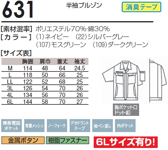 新品☆SOWA 半袖ブルゾン 作業着 ワーキング M~6L (631)